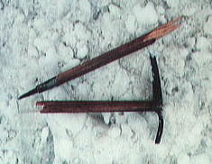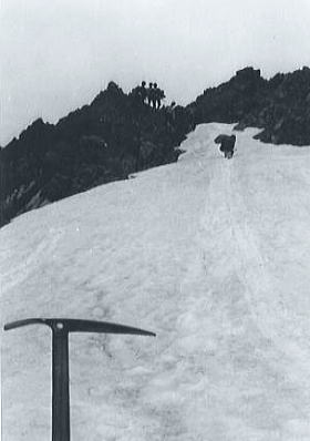 長次郎雪渓・・滑落事故 長次郎ノコルより雪渓に入る。ここで私自身反省すべきことが起きた。 長次郎雪渓には3年前に真砂沢ロッジにbcを設け.道中を含め10日間掛けて剣岳東面の尾根と谷を登っている。 その中心に長次郎谷がある。何度も登り下りしクレパスやフランクフルトの場所なり.雪渓斜面の状況は把握していた筈だった。 そして今回はザイルの使用を前提に計画を立てていた。 ザイル確保による下降を念頭に入れていたが2年生のファイトで最とも急と思われるツメの斜面を20m程独自で降ろしてみた。 それが上手くいき距離を短くして下らせた。過失は下降以前に雪に慣れぬ重荷にあった。 八ッ峰と後立鹿島槍ヶ岳 滑落,ストップ地点から右肩は布引山一瞬の転落 雪径最上部から100mほど降りた地点で飯田君が転落する。 私は彼を確保する為.20m程下で態勢を取り見守っていた。 まず二年生中沢君が降り上手くいく。この分だと11時前に熊岩にテントが張れるぞと頭に閃く。 折れたピッケル その直後飯田君が転倒. 確保した私のピッケルは真中からシャフトが折れ,私も飛ばされた。 折れたと言うより転倒の反動で無意識のうち.彼に飛びついていた。 彼は一瞬.停まりかけたと思われたが私が見た時.再び一緒に落ち始めている。 キスを背負った間々彼に自然と飛び付き.早く停めねばと気は焦っていた。見る々スピードがでる。 ピッケルが折れシャフトは弾けるよう飛び.反動で私も飛ばされたのは覚えている。 ただ彼に飛び付いた瞬間は覚えていない。倒れ起き上がる前に,上から被さるよう飛び付いていた。 見た目では一瞬.停まったような現象だが.体が反射的に飛び付いていた。 重なった一瞬は斜め下に被さりスピードは落ちた気がする。ただスピードは直ぐ増しだした。 私の頭が真っ直ぐ谷へ落ちて行く。頭の前には彼の足が雪面を叩き.舞い上がる雪粒で視界を閉ざしていた。 スピードは二人の体重とザックの重みで物凄い勢いで加速した。 私は「足を上げろ!」「足を上げろ!」と繰り返し2.3度言ったと思う。 後から思えば彼は判らなかったと思う。判かっても焦り道理に行く筈はなかった。 その間々,私の探る動作が彼の体を半回転させている。 彼の頭が下を向き.私はがっちり彼の体を被い.手が雪面と摩擦するのを感じた。 |