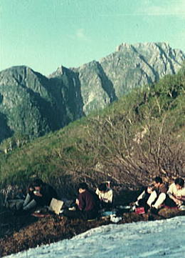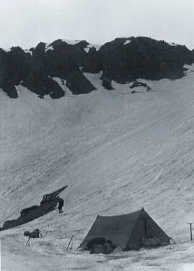 | 熊岩,仮Cs 小雨は今にも本降りになりそうだ。早速Csを熊岩上に設営し全員がテント内に落ち着く。 ローソクに火も点り2年生は水を造る為に雪を溶かし.暇な者は天幕内を整理している。 今日,一日のアクシデントも炊事に精を出し.コンロを囲んでいると皆に落ち着き元に戻ってきた。 笑い顔が現れた。冗談に飯田君も答え出している。否や反論しているようだ。 山行の峠も越し皆が笑っている。久し振りの雪上幕営で破邪いでもいる。16時 熊岩,仮c2―真砂沢出合c2 |