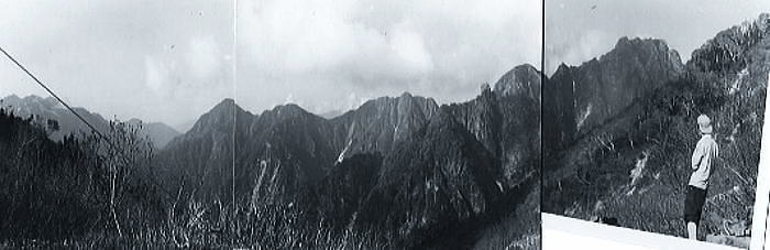 | 最後のツメ.脆い岩稜を終わると剣岳山頂に飛びだした。 汗で体が濡れ肌寒い.早速コンロを点ける。ツエルトに暖かみが篭もり湯は体を芯から温めている。 今回の目的の1つである裏剣岳. その里に入り高度差と剣岳しか登れぬ裾野を越えてきた。 頂に立ち曇天の頂でも私には安らぎと安堵に満ちている。これから下る雪渓も懐かしく.心は弾んでいた。 後半は仙人池から欅平にでて.宇奈月にでる積りでいる。 遥かなる眺望 視界は曇天であるのも関わらず.恵まれた眺めは見渡す限り望められた。 手前.立山連峰から南方に目を向けるなら.遥かなる遠く笠ケ岳への尾根が槍.穂高連峰へと続く。 目を更に戻すと燕岳から後立山連峰が延び.昨年秋縦走した白馬岳から蓮華岳への峰々が黒部川を隔てて眺められている。 霞む灰色の岳が墨絵のよう望め.鹿島岳.五龍岳と綴り.白馬岳から先に延びる朝日の峰々へと綴られていた。 海岸線を通し能登らしき影が見定められていた。白味を薄く帯び富山湾に突き出した岬.能登半島も朧に見える。 ホアイトプリンセス 周りは少し薄暗くなる。南方を見るに延々と延びた梅雨前線が.ちょっとの間に随分北上した。 もう悠著していられない。白く湧き出したガスも黒ずみ.見えていた槍の穂先はもう雲堤に呑み込まれて隠れていた。 眼前まで雨雲の黒い堤が押し上げられてきた。 今先輩達OBアカレンガのメンバーの富山.新津.中山各先輩がRHC創立10周年記念行事として.アラスカの処女峰ホアイトプリンセスに挑んでいる。 先月東京を発ち.今は登攀のため荷揚げの真っ最中だろう。その後.ホアイトプリンセスにアタックする。 目に見えぬアラスカの岳.ホアイトプリンセスの方角を望み.「ガンバレ節」をガナり頂を跡にした。 アカレンガの会員は富山.新津.中山.田中と在京は田中.根岸先輩と同期田沼に私。 長次郎ノコル―熊岩.仮c2 11:10長次郎ノコル11:25一12:25小:40一14:00熊岩上部:20一14:32二股.仮c2 乗越より長次郎谷を覗く 五龍岳.鹿島槍ケ岳.爺ケ岳 |