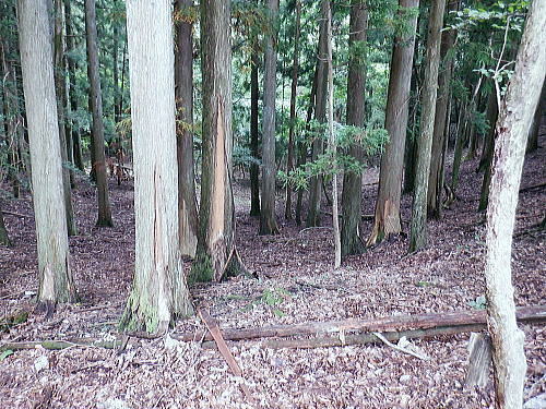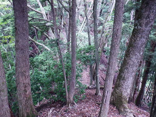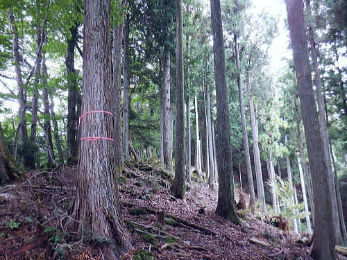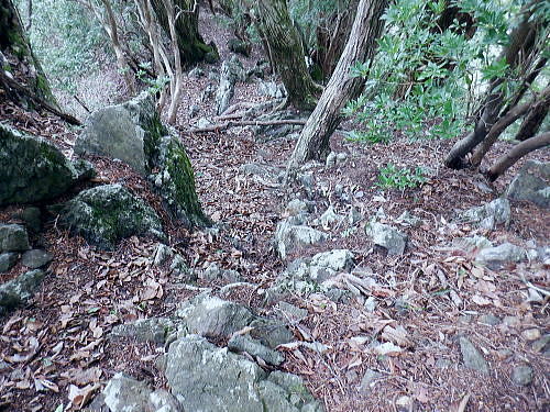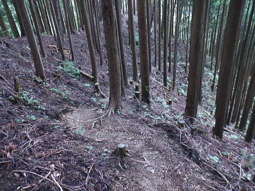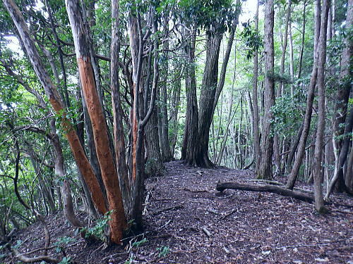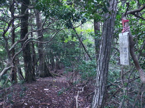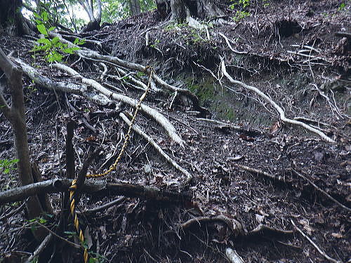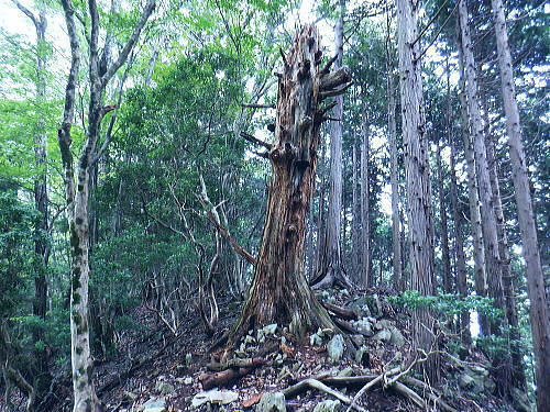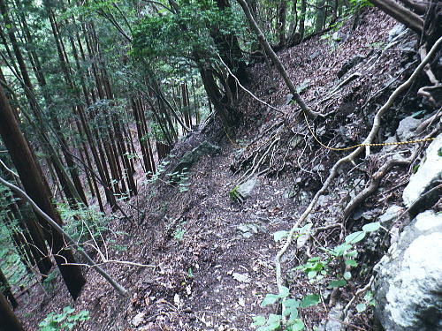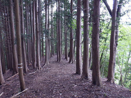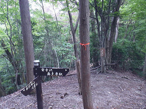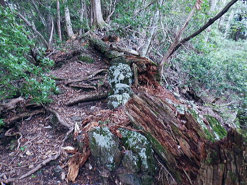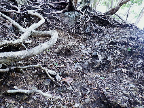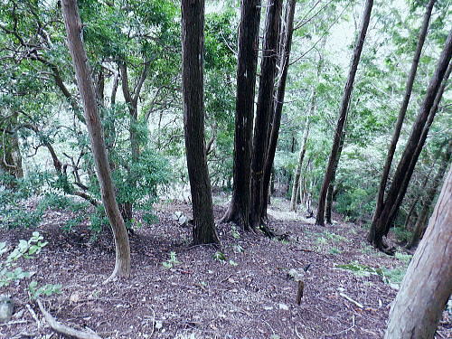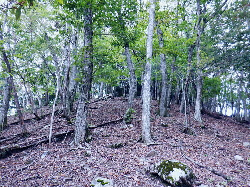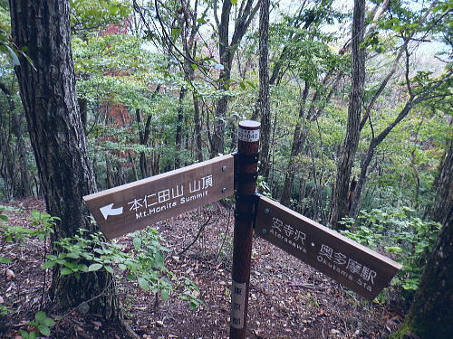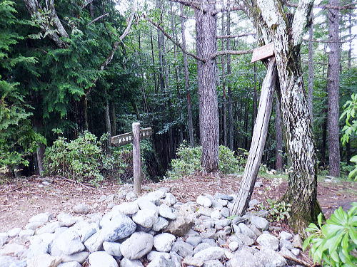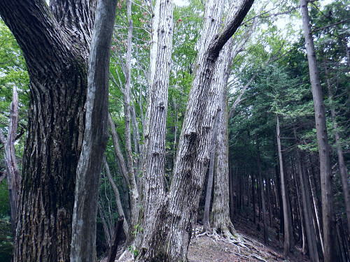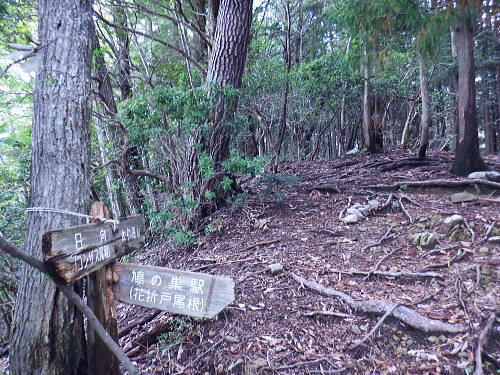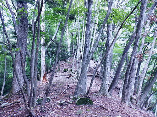 | 今回は以前登ったjr白ノ丸駅からの根岩越えの権指尾根と合わせ.ようやく繋がるコースを取ることができた。 ここからは花折戸尾根を経て同じコースで本仁田山に立つ。前回訪れた時は春雪が積もる中.浅いラッセルをしている。今回は9月の猛暑日を迎えていた。 そして迎えた頂は以前と全く異なり整地された世界を知り.奥多摩三大急崚の尾根と云われる大休場尾根を下る。 奥多摩駅裏から氷川屏風岩.権指尾根760m圏の南西支尾根 ゴンザス尾根.花折戸尾根から本仁田山に立ち.大休場尾根の大休場・・変貌した山頂 大休場から安寺沢林道にでて除ケ野沢から氷川工場の破線を綴り奥多摩駅 権指尾根 権指尾根と合流.10:08氷川屏風岩.権指尾根760m圏の南西支尾根の突き当る。ここからは権指尾根に変わる尾根筋を詰める。 前回は白丸から根岩越えをして日原線5号鉄塔付近に登り突き上げている。 F.白プラ. 810m圏で珍しい古い白プラ.10:09 林相の境と老樹.10:18 00m圏の一部開かれた尾根筋と林班界標板.10:20 10:23 850m圏.10:27標高866m点 10:37樹間を透しての高仁田山 権現尾根から.10:41 10:41 10:43 10:46 900m圏.10:50 10:50 980m圏のjr鳩の巣に下りる花折戸尾根の分岐.11:12ここの道標は私と同じで.大分古く疲れている模様。入山時エスケープとして考えたのが1番はこの花折戸尾根を下ること。 2番は築魔山東尾根. 西川林道に下りて.杉ノ戸尾根と合わさり.大根山ノ神から?ノ久保山に回り込むコース.古里附にでる。 それとも大休場尾根を下るか? 安寺川へ下れたならば除ケ野に寄ってみたい希望もあるが。 鳩ノ巣方面.11:12このコースは鳩ノ巣駅からの取り付きがが判りづらく.駐車場前から前の青橋を渡って登る口と青梅街道を渡りトンネルの左側の小さな祠の階段から登る口がある。 あまり人が通らないらしく.途中で藪になっている所がある。 本仁田山花折戸尾根 何故か丸石が幾つも置かれていた.11:13 獣に綺麗に?がされる.11:14アケビに囲まれた築魔山 以前は石標だけで山名板はなかった。11:21丁度10年前の2016年3月は春雪が積り.ここ築魔山1040.0m点が雪線だった。急に積もりだした雪面に軽いトレースを付けている。 コースは上へ上へと登ればよかったが.この先だけは下り勾配で尾根幅が広がり.真面目の登った記憶がある。 頂を過ぎるとアケビが生い茂る森になる。 「池ノ平」010m圏鞍部 築魔山北側の鞍部.11:22築魔山の頂から北側約200mの平地を「池の平」といい.小さな池がある。「池坪ノ峰」は棚沢地区の人達の呼称。大蛇伝説があったようだ。 古い「池ノ平」と書かれた木札.奥多摩唯一の山上池とのこと。時期によっては(3×3m程度)が出現するようだ。ヌタ場でもある。 立木に掛かっていた木板には「私称 本仁田池 公式名不詳」.裏には「1040m.築魔山」とある。 以前訪れた時は雪被る雪原のカール状だった。11:33築魔山を越えたこの先.続いて2ケ所で月ノ輪熊の糞を見ている。古いのとまま新しく積もる糞.今月上旬には陣馬山の東側の尾根で. 後ろ姿だが谷間に遠ざかる熊を見ている。東京都は絶滅危惧生物種として平成20年から保護の為.捕猟が禁止されています。期間は令和3年31日まで。 花折戸尾根1080m圏の小平坦地 本仁田山東尾根のツメ.12:361080m圏で登山道を左に回り込むと急登で大休場尾根の分岐へ取り付くコース上にある平坦なコブ。左に回り込む手前の1080m圏の平坦な東肩. アセビの茂みの先に赤帽黒杭がある。本仁田山東尾根の下降地点. 東左が歩き易そうだが尾根は右下へ下るとある。 下部の岩崖の巻から西川の林道にでるのが問題? 本仁田山直下の分岐 大休場尾根と花折戸尾根との合流点.12:39本仁田山(高指山) 不老林道本線のセンター手前で.・・2016.07.11/4:37日原川を隔て平石山妙指尾根.本仁田山大休場尾根.花折戸尾根とチクマ山権指尾根. 右奥が赤杭尾根の957m点コブ付近。 対岸の送電線日原線は中央から右に妙指尾根に建つ10号・9号鉄塔と大休場尾根に建つ8号鉄塔。16年3月の半ばに妙指尾根を下り.10号鉄塔基部から 逆の立場で妙指尾根を見上げていた。この時.10号鉄塔基部から撮った狩倉山(不老山)写真を仰ぎ写真で.入山を決めた山行にもなっていた。 林道を何度かカットしては横切り.違った雰囲気の路面に変わり.更にカットを続けると本道らしき林道に入り. 左手に切り開かれた展望台地を横切る。広がりを見せる風景は当時登り詰めら本仁田山の山並。各支尾根に送電線鉄塔が連ねている。 jr白丸駅から日原川対岸の権指尾根を詰め高仁田山にでて.当時は平石山妙指尾根を下り日原川沿いの寺地に下りていた。 本仁田山 三等三角点標石.標高1224.45m.基準点は同じく「本仁田山」.12:44以前訪れた時とは大分異なる風景に変わっている。売店の小屋跡の残骸があり天井や壁の骨格は分かるものの崩壊した姿。 ここは建っていた小屋跡の残骸付近から撮影している。当時の頂は小広い感じの割には凸凹の頂だった。・・10年前の山頂 頂の周りは膝中ほどの積雪だったが.頂の部分だけが日当たりを受け融雪し地肌を現わしていた。又南面