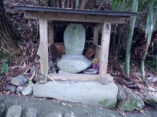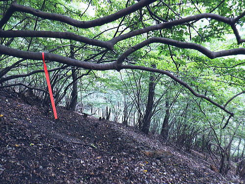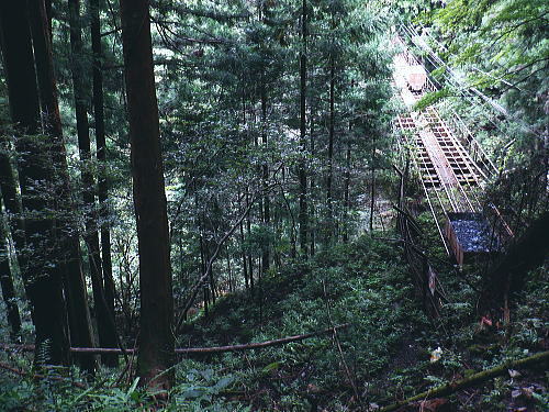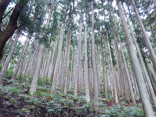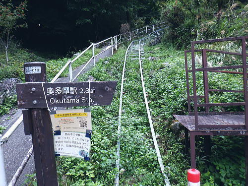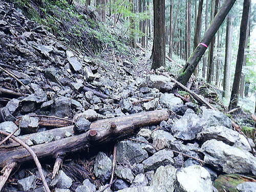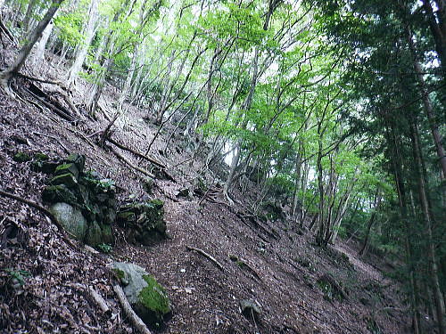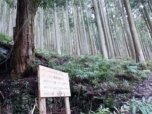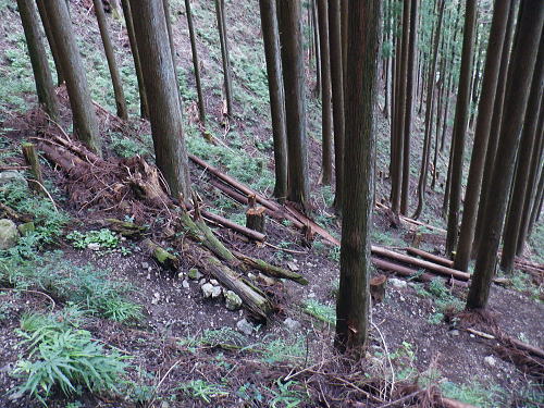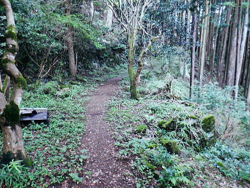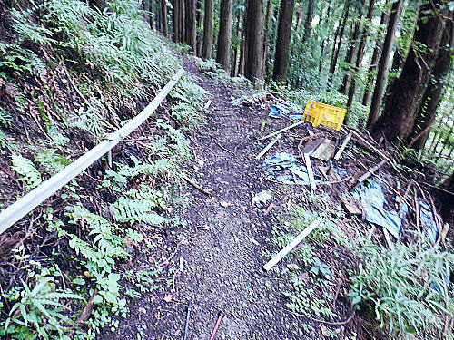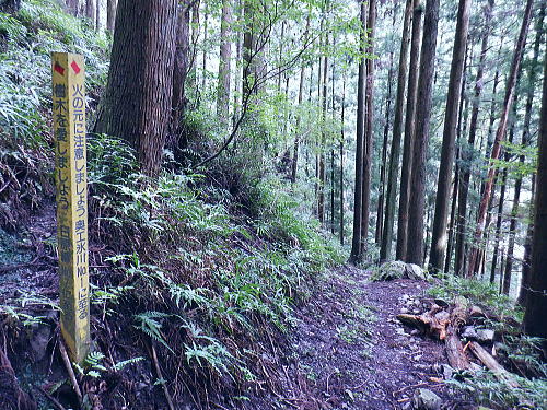 | 大休場で1本取り.安寺沢沿いから日原川左岸の安寺沢林道にでて.町道に移り除ケ野の破線に乗る。 除ケ沢を横断し.奥多摩工業氷川採石所から小学校の裏を抜け.朝方の入山の細道に戻る。 jr奥多摩駅から土壁の氷川屏風岩尾根・・権指尾根の西側ルートから入山 ゴンザス尾根.花折戸尾根から本仁田山に立ち.大休場尾根の大休場 大休場から安寺沢林道にでて除ケ野沢から氷川工場の裏側の破線から奥多摩駅・・朝方の踏切へ戻る 大休場ノ頭分岐 大休場尾根の上部を振り返る.13:42登山道はザックの所から直角に折れ.U字に回り込み.Z字にジグザグ道が安寺沢へとかなりの激坂が続く。 急斜面の上.滑り易い土上に砂利が敷き占められていた。上の道標の腕木にも手書きで「スベルヨ」と書かれていたが.なるほど滑り易い山道になる。 急斜面が続く. 根元が崩れ裸の根を現した所が幾度かある。13:50 750m圏にも整理された間伐材.があり.13:55所々にまとめられた倒木材の山を見る。 里近くの緩斜面をトラバース.14:02 手入れの良い植林帯を抜ける 550m圏の作業道終点.脇に立つ林班板.14:14「森林再生間伐事業 林班名.146-02-11.14-16林班」. 第一回間伐:平成23年.2回目は令和7年。 安寺沢の分岐点 山道を降りての道標.14:17左の腕木には「秩房観音50m」.「登山安全祈願」とある。登山道を少し外れ乳房観音へ。 秩房観音540m圏 安寺沢の上流側だが距離50mと短く.ピストンし参拝.14:19鎌倉時代に植えられたと云う銀杏の巨樹は二代目が成長中. 銀杏の大木の巨大な乳根から伝わることで.気(乳)根が何本もたれている。乳首の下のツボの位置にでてきた姿が銀杏の乳根に似ている。 そことからの縁起物らしい。銀杏の立木には乳根があり.成長すると地面に届くそうです。近年.乳癌に罹らない御利益があるとのことで信仰が厚いとか。 民家脇 戻り.民家の縁側角を入る.14:23山道から民家角にでて.奥の縁側脇を左に折れ.白い手摺のある坂道から安寺沢林道へでる。 写真.突き当りの角右の分岐は安寺沢沿いの道ですが地図上では500mほどで消えている。 大休場尾根からの登山道末端 舗装された安寺沢林道の登山口にでる。安寺沢林道にでる。林道沿いに左へカーブて除ケ野を過ぎ.日原川の床底の広がる氷川国際鱒釣場のある女夫橋を渡りれば栃久場にでる。 北氷川橋西詰にでてからは右に折れれば日原街道にでる。左に渡ればjr奥多摩駅にでられる。 林道は日原街道と並行して延び.殆どが舗装されていた。.直進(西)に林道を下ると南側から西側に回り集落に入り.550m圏で終えている。ピストン林道. 安寺沢林道に突き当たる 登山口終点518.0mの珍しい2本レールの運搬施設I.除ケ野口(ヨカイ) 右脇の電柱には「安寺寺沢支23」と記されていた.14:46 14:25除ケ野への分岐400m圏. 側壁の道標には「←本仁田山 奥多摩駅→」とある。腕木の「奥多摩駅」のコースは右に回り込むと直ぐ女夫橋にでる。 右岸の下流は氷川国際マス釣場。過って子供達と訪れていた。南氷川橋から奥多摩工業の表側. 日原街道にでて栃久保で北氷川橋を左岸に渡ればjr奥多摩駅にでる。 今回は除ケ野へ回り込む。除ケ野地区口の舗装され.た広い分岐の立派さには驚くほど当惑し.もう少しで間違えるところだった。 失礼な云い方だった。左の地図の黒線.町道から除ケ野の集落を抜ける。 想像とは異なる除ケ野の集落.集落に入口周辺には小さな駐車場が結構多く見られたが.ここ住民の為だろう。集落内は綺麗な車道が走る。 奥多摩古道 現在は除ケ野から氷川へは日原川に架かる北氷川橋を渡って行くのが普通だが.安寺沢林道が除ケ野まで開通した昭和50年代から使われるようなったと云う。 古い地図では日原川左岸の山腹を緩やかに下ってゆく道が描かれている。表記は「破線であり」.現在も地形図には「破線」で描かれている。赤色. 除ケ沢左岸部分は現在改修工事中だが「中断」と標識が付けられていた。ただ短いが普通では歩けぬ状態になっていた。 石尾根の三ノ木戸と六ッ石山 集落から栃久場地区を越えての三ノ木戸山方面.J.集落最奥の廃家屋 430m圏の右裏奥からは地図上の除ケ沢右岸の破線を綴る.14:50集落の一番奥の家屋までは立派な舗装(地図の黒線)が付けられていた。ここは除ケ沢右岸の縁.ここからは沢沿いに山道が綴られている。 廃道ではなく公益の奥多摩古道.破線路であり.町道でもあるようだ。 家屋裏からの破線の山道.右岸の町道へ.14:51作業道に入り氷川小学校まで町道らしい通工事中の山道を越える。 整然とした植林の除ケ沢右岸道.14:52モノレールの三叉点 懐かしい「ひろげようもりへの感謝と」の看板.14:53破線はよく踏まれていた。荷物運搬用の簡易モノレール. K.巡視路分岐 送電線日原線の鉄塔巡視路と町道の分岐.14:56日原線7号分岐鉄塔 巡視路標柱には「奥工氷川1.に至る」と「日原線7に至る」と2つの送電線が記されていた。 「奥工氷川1.は本線から1本分岐させ.これから先.訪れる氷川小学校裏に建つ変電所へ下りている。 「日原線7に至る」は大休場尾根の下部に建