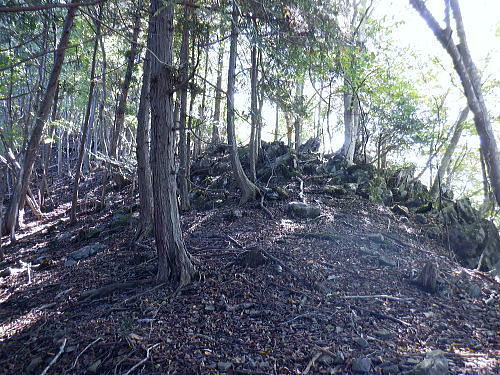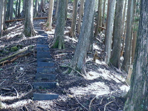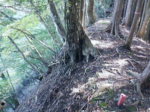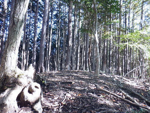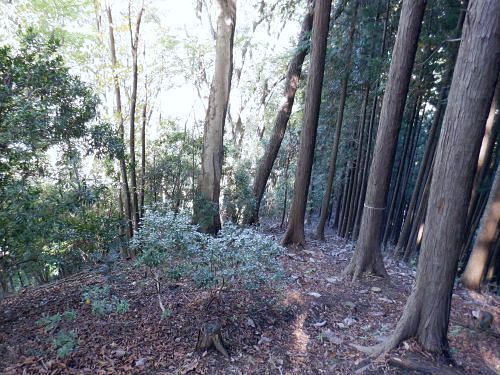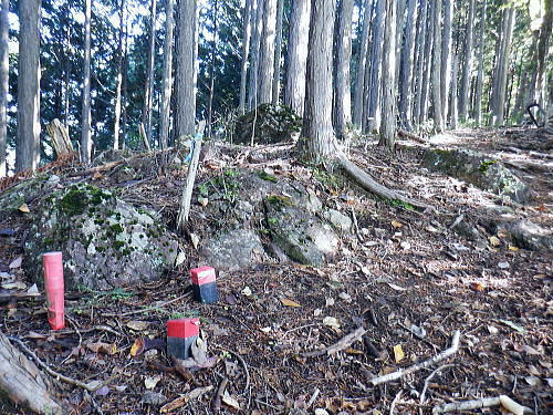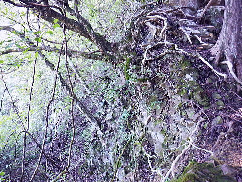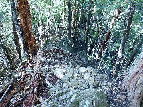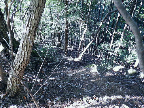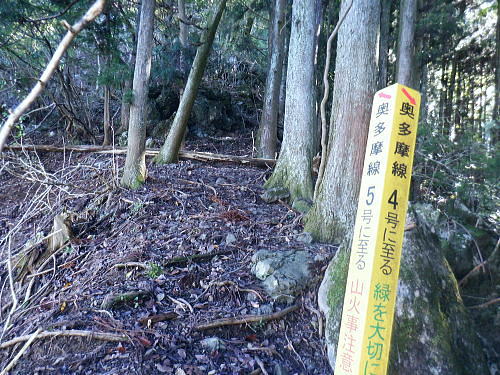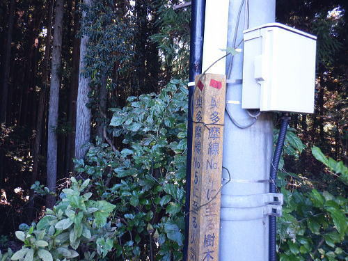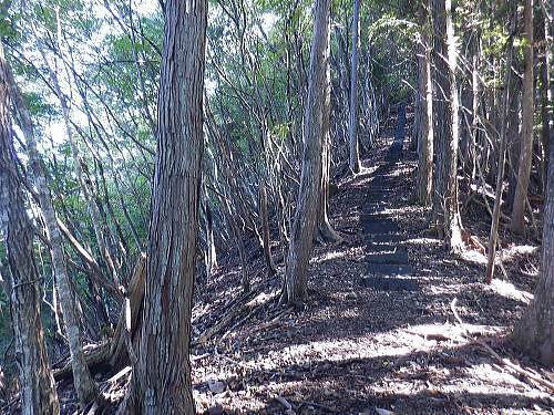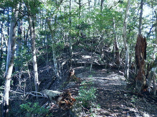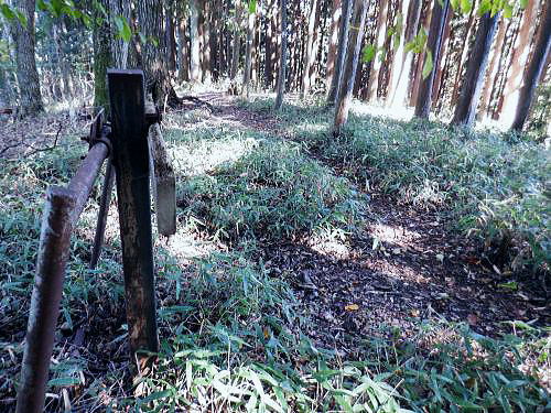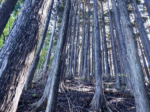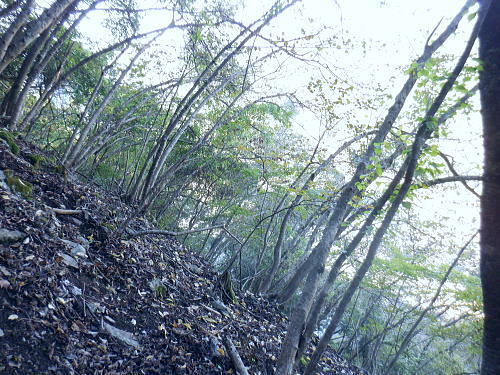 | 棚澤城山西尾根の標高559m点Pを越え.奥多摩霊園から奥多摩線は西尾根から北尾根大楢峠を目指し.松ノ木尾根に乗る そして寸庭の集落から夕陽向カイ尾根へと歩む 海澤の発電所から城山西尾根の510m圏 標高559m点から霊園を経て城山北尾根・・以外と深い痩せ尾根の岩交じりの尾根 大楢峠から松ノ木尾根の末端にでて夕陽向カイ尾根.愛宕山 寸庭川右岸尾根から石積沢両岸尾根と丹三郎尾根からjr古里変電所 D城山西尾根510m圏から北尾根の大檜峠へ 山道から再び霊園を抜け奥多摩線の鉄塔を探索しながら城山を越える.9:00510m圏の旧モノレール軌道跡の終点から尾根沿いを歩み.一時は蜘蛛の巣が満尾根になる。 何でもありの藪と倒木は岩稜混ざりの這尾根を歩む.9:08ワイヤーの張り巡らされたレールは解体された.広い尾根道は藪からむ痩せ尾根に変わっている。 南方下の2鉄塔 460圏で経路は不明と.9:13高度にして後40mほど登ると緩やかな500m圏にでる。その縁付近から右.南東に延びる急斜面の尾根の420m圏に2鉄塔が建つ。 鉄塔の眺めることも出ぬ場所.巡視路は後の調べによると廃道になっているのかも。 藪絡みから林相の境に入る.9:22 500m圏の植林帯.9:23 古い赤い円柱プラ杭と大きなな赤帽黒杭.9:28 下って.9:31標高559m点の小広いコブ 1つ赤プラ杭がある尾根の二又.9:38ここ直ぐ先の右脇から南東へ延びる急だが大らかにゆがむ尾根の510m圏に奥多摩線3鉄塔が建つ。 巡視路は廃道に近いらしい荒れ方のようだ。又.霊園に入り.上部の4鉄塔基部近くからは2鉄塔が眺められていた。 E奥多摩霊園 コブの下りから霊園へ9:41 尾根筋の中央台地.9:41 棚澤城山の南側尾根と大楢峠西尾根からの棚澤城山 手前中央の550m圏コブと重なる城山.9:45手前中央に聳える小さなコブは550m圏コブには奥多摩線の4鉄塔が建つ。 城山の頂.右側に落ちるのが城山尾根で小檜峠.大檜峠から鍋割山に登り返している。 前回月初めにはその奥の高岩山のサルギ尾根から登り.城山北尾根を降りている。今回は頂を十字に切ろうと考え. 都交通局が管理する奥多摩線の巡視路を最後まで綴ることにした。邪道とも云われそうだが.結果的には私の好む変化にとんだルートになる。 城山北尾根と西尾根 前回の北尾根の窪口が大棚峠には5号鉄塔が建つ.9:55右手の半ば下部のコブには4鉄塔が建つ。 城山西尾根の標高559m点峰 霊園5区より北西側.右奥は権現尾根の筑摩山.10:03城山西尾根に乗る奥多摩線2鉄塔 霊園5区より西側の西尾根を振り返る.10:03綴ってきた城山西尾根の標高559m点峰と南側に奥多摩線の3鉄塔が建つ。 その西尾根の先は鋸尾根の標高点726mコブと愛宕山507mで下って氷川地区になる。 510m圏小コブ 霊園5区から見上げる4鉄塔.10:06車の場合は海沢の右岸道からイロハ坂を登り切ると小コブの右脇にでる。 霊園から再び西尾根の取り付きは小コブの左側鞍部.6区の右奥角になる。 再び西尾根へ 霊園6区の小さな倉庫裏から西尾根に復帰する。10:08電柱に括り付けられた黄色いL字の標柱には「奥多摩線5に至る」とある。 霊園からの巡視路取り付き地点.10:094号鉄塔は6区の鞍部から登れそう。ここから巡視路標柱は「avから「号」へ。「4号.5号に至る」とある。 霊園からの先は痩せた岩稜の急登にでる筈だった。が踏み跡に気が付かず.巻道のトラバースに道を求め.戻ろうにも前2間の降雨が 激斜面をぬかるみさせ.抉る滑る斜面に変えていた。戻るのもおぼつかず.怖さが先に立ち諦めている。 倒木等障害物のあるトラバースの踏み跡を忠実に歩む。時間的には少々係ったかも。でた所は巡視路のプラ階段。安とした長い階段だった。 560m圏え左側の山道へ.10:17倉庫の裏には大岩がゴロリと横たわり..その先にも登れるか.微妙な岩壁に立ち塞がれ階段にルートをとるとあるが.その最初の踏み跡を見失っている。 最初は巻道に気が取られ.二日間の降雨で湿り気を帯びた台地の微妙な滑り気に難渋していた。一度戻ったものの本来の尾根筋を歩むことにした。 見妙なトラバースを繰り返しての尾根歩き。尾根右寄りの窪んだ溝沿いの梯子ルートに期待していたが遠ざかるばかりで諦めていた。 トラバースの後は尾根へと回り込む.10:18 主尾根にでて.10:24 細かな露岩から主稜の西尾根にでる.10:25620m圏 そしてプラ板を立てて土留めされた階段巡視路に入る.10:27 600m圏.長いプラ階段はもう1つを加えている.10:33 次第に高度を上げる.10:35 痩せた岩稜帯へ.10:37階段を登りきると痩せた岩稜に変わり.右が植林帯.左は足元から切れ落ちている。 ちょっと上に東電の黄色いL字の標柱がある。「奥多摩線5号に至る」とある。 ここから5号への巡視路は尾根筋から分れ.西尾根の山服を水平移動していた。 その上は藪絡み.10:41 痩せた岩稜は踏み込めぬところも現れる.10:45 振り返る右手は鳩ノ巣周辺の集落が樹間を透し望まれた.10:54 最後の急登でゆるむと城山の頂に立つ.10:57棚澤城山西尾根 氷川発電所付から入山する。尾根下端に設けられた落石防止用の山肌に張り回らされたウィヤー網の工事終了した姿を縫い尾
