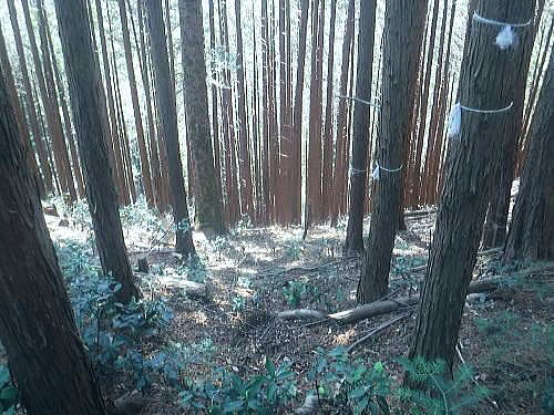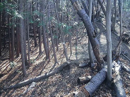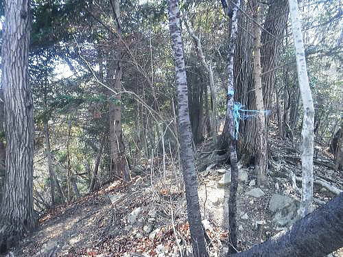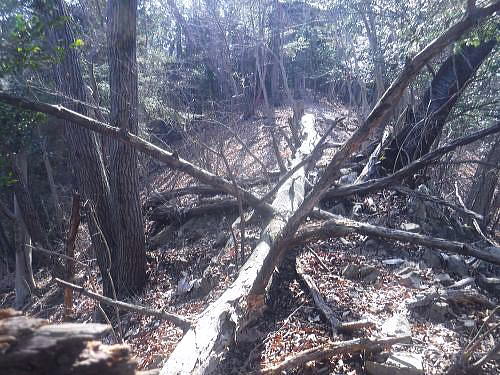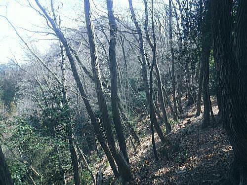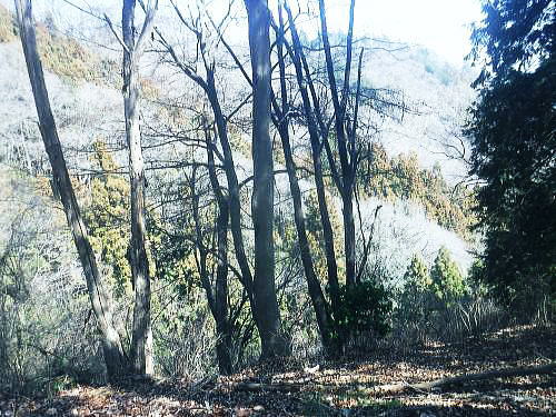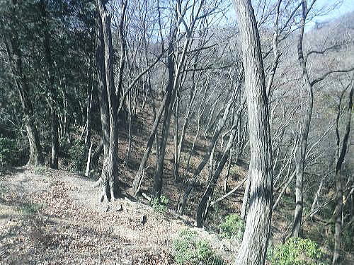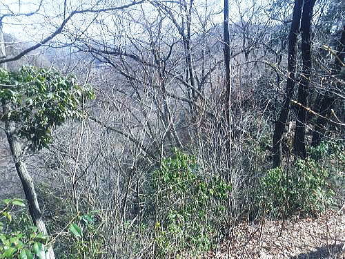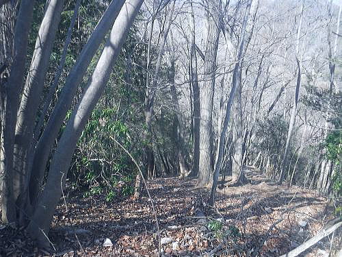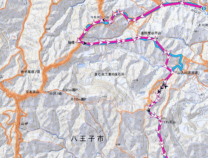 | 独標から遠野谷戸山を越え.コブ手前の鞍部から小沢を下り.菱光石灰工業の入口前を横切り.林道からヒット石山北尾根を詰める。 まずは南側の山入川右岸尾根(入山尾根)へ再び登り返す。 「川口川上流端」から今熊山を越え.独標(川口川ノ頭) 遠野谷戸山から採石所口の車道にでてからは「山入川源流端」を経て林道に入り.ヒット石山北尾根へ・・倒木で昼食.軽アイゼン付ける 入山尾根に乗りヒトッ石山から向山.390mPの南支尾根分岐. 370mPでは小津町へ降りる南尾根の分岐にでる 同370mP2からは琴平神社にでて三神牧場口からは県道61号線.美山トンネルを抜け八王子西ICへ・・川原宿大橋bs 独標から菱光石灰工業の北側採石所へと回り込み.ヒトッ石山北尾根で昼食 独標10:17―1:13遠ノ谷戸山―11:40.「やまいりかわ上流端」―12:35北尾根の倒木. 独標東肩から遠ノ谷戸尾根 独標から東に延びる遠野谷戸尾根で.まずは遠野谷戸山へ. 川口川ノ頭とも呼ばれ山入川左岸尾根になる。源流周辺は全て菱光石灰工業の採石所になってをり.採石所口の車道前に降りている。 菱光石灰工業の採石所を取り囲む尾根・・園の谷戸尾根と入山尾根 2026.03.21.北浅川・・地形的には上恩方町.下恩方町を流れる北浅川本流の北側を併行して連なるのが恩方アルプス。 地域的には上恩方町から小津町に入り.北側の小津川から小津林道を遡れば入山峠にでられる。 更に入山峠から北側の入山尾根を越えれば美山町の菱光石灰工業の採石所がある山入川の源流にでる。 北高尾山稜の北側の流域と合わさる広い流域に入ると高尾山大垂水峠からの北浅川流域と合わさり多摩川から東京湾へ流れる。 今年の春先は酷い渇水に見舞われ涸れ沢化した。 下流側を横切る首都圏中央連絡自動車道は恩方トンネル.美山トンネルから八王子西IC.へ更に高合峰山トンネルを潜り.川口川を越える今回のの登山口にでられる。 秋川流域に変わり.川口川沿いには秋川街道(八王子五日市線)が綴られていた。その対岸は秋川丘陵になる。 今回は採石場へは今熊山から独標にでて採石所北側を右回りに採石所口へと下る。又山入川は「山入川上流端」で対岸の右岸に渡り. 入山尾根のイチッ石山北尾根を登っている。下りは入山尾根伝いに末端の美山トンネルを潜り終了した。 10年前の菱光石灰工業の採石所の地形図 2016.11.08/.15時頃.斜陽する上段台地の採石所を見下ろし下降入山尾根と採石所 当時は朝方.盆堀林道を経て石津窪山大萱尾根をピストン。林道を遡り入山峠から入山尾根に乗ている。そして菱光石灰工業の採石所を下り美山町バス停へ。 入山尾根を下るには少し強引な山行だった。日没まで時間が足りないと思い.途中から引き返し.菱光石灰工業の採石所へ直接降りている。 「通行止」.「危険!」の看板もなく.山道を穏やかに下って採石所にでている。却って広大過ぎる採石所で迷う始末。 超大型トラックから普通のバンに乗り換え美山町バス停まで送って頂いていた。先月の山行では前盆山南東尾根を下り小津川二俣に降りている。 そこから望められた入山尾根は私を取り囲むように眺められていた。この景色の山々を10年前に尋ねた想いが湧き上がり.再び尾根を繋ぎたく入山した。 尾根取り付きから遠ノ谷戸尾根に方向を変え.遠ノ谷戸山へ 今熊山 菱光石灰工業の北側に並ぶ工場群 採石所はここから競りあがる南側の背稜.入山尾根に至る採石場がある。 仄かに遠いい遠ノ谷戸山 脇には小さな白い馬酔木が一面に咲き競っているものの.水気を失い哀れな姿に枯れのでは.悲しい感じを受けている。 合わさると以外と踏み跡ははっきり 遠ノ谷戸山 遠ノ谷戸山404m 更に尾根伝いに下ると410m圏コブとの鞍部にでる。越えて左前方下から林道糀谷山線が横切れば.電柱のロープから降りられる。 北側の川口川と南側の山入川を繋ぐ林道がこの先で横切る又鞍部から右の小沢沿いに下れば.直接里の民家にでる。 又林道糀谷山線から羽生入林道を分け.左へなんかすれば山入川の二本杉にでて.対岸が芳村石産にでて.左に下れば美山工業団地にでる。 右斜面を山入川へと下り.小津川と隔てる入山尾根を登り南下する 不明瞭の所もあるが.このコースを変更し鞍部から集落に下る予定でいたが.直接長い平坦地を歩かずに採石所口に下りる。 「JA」の少し手前の立木に細い白テープで幾つも結ばれていた。その緩い窪溝らしき斜面を真南に下る。 恐らく菱光石灰工業の採石所口辺りに降りられると考えた。時間の短縮にもなるだろう。高度差は少ない。 中央の小沢を下ってきた。左脇は採石所の建物と駐車場。 車道にでると丁度トラックに挟まれるようパトーカーが何の用事かこんな山奥に登って来た。停めてバス停を尋ねると直ぐ下流側の集落にあると。 直ぐ下流側には最奥の集落があり.jr高尾駅からの路線バスの終点になる美山町バス停がある。 10年ほど前の山行では前半は石津窪山をピストンし.後半は入山峠から入山尾根に乗る。ただ日暮れ近くなり豆佐嵐山.沖ノ窪ノ峰を過ぎ. 610m圏