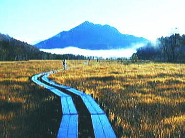 | アヤメ平 樹林を抜けると再び湿原にでる。よく見ると標識が2.3本立てられていた。 その1つに近ずき顔を寄せ付けて見たら.「高山植物を大切に」と読み取れた。 アヤメ平かも知れない。冷え込む体を気にし早々に素通りした。 尾瀬.日光の山々.赤城と昼間は眺望を楽しませるてくれる筈の稜線も.これでは闇の一陣でしかなかった。 それでも単調そのものの木道に小さな変化を見出している。 古い腐り掛けた丸太や真新しい.そして太い或いは細い丸太が1本.時には3本も組になって幻じみた稜線を綴っていた。 2度目の標識は〇田代と読み取れた。頭の字は分からないが横田代(中ノ原)だろう。 そうすると先程の標識の所がアヤメ平になる。 鳩待峠へ? 樹海に踏み込むとビビたる明かりも全く閉ざされた。 暗い闇の中.眠気に慣れるも.一睡もしない体は次第に眠気を起こさせていた。 途切れ途切れになった木道は歩き難し.泥炭の土壌に踏み込むと靴は尚更体を重くした。 僕等は闇の径を右寄りに下り始め山ノ鼻までの1本径と思っていた。それが鳩待峠に誘い込まれている。 気が付いたが遅し,ライターの明りを頼りに地図を覗き込む。やはり間違っているようだ。大きく迂回したことになる。 木の根に腰を降ろし.空を仰ぐと何時の間に鏡のような煌くお月さまが昇っている。 低い早い雲層が西方へ流れされて行く。それが途切れ途切れになり.その上に雲1つない青空が広がっていた。 天気予報とは裏腹に今日一日の晴天を約束しているようだった。もう夜は明けようとしている。 鳩待峠 山径をドンドン下ると灯が見え鳩待峠にでる。鳩待も稼いだとばかり.威勢よく降りたもののマイカー族にカッカリ。 今まで夜径を歩いて来た報いは落ち.一変に力が抜けた。休む気も起こらなくなる。 早速.逃れるよう川上川の右岸を径を尾瀬ヶ原に向かい歩みだす。 もう闇夜は明け方の明るさに押され.淡い白味を乗せた明るさが薄いベールとなり広がりだしていた。綴った鳩待峠U.V.W 富士見から一定のペースを保ち来たが視界が利き始め.そのハイペースに互い驚き見会っていた。 足元の視界はドンドン飛び去り.よく歩き続けた気がする。闇で分からなかったせいもあろう。 単調な木道を睡魔から逃れる為.足を踏み外さぬよう自然と少し足を早めていたのようだった。 朝日の山ノ鼻より温泉小屋 |