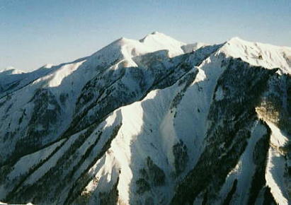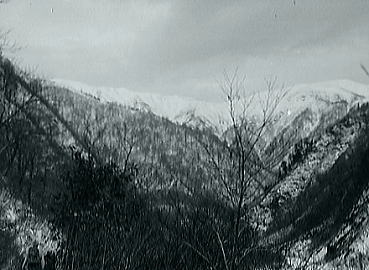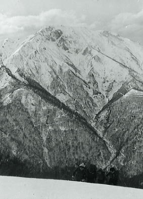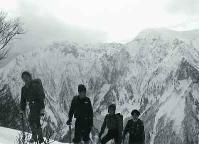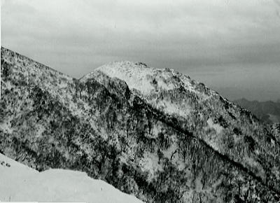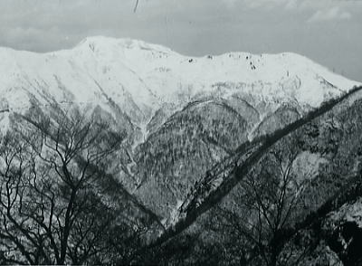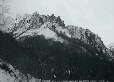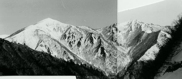![]() s46年12月.武能岳東面でザイルワーク訓練の折.対岸を撮る。笠ヶ岳と白毛門山 |