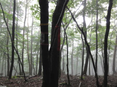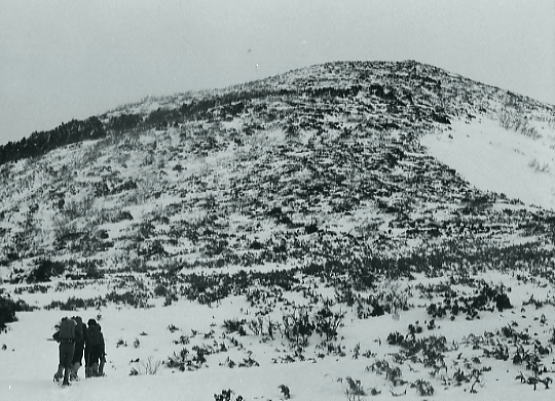 | 湿雪と藪 100mほど辿って右の枝尾根に取付く。場所が悪かった。急な上.浮き枝に15cmばかりの積雪が埋もり.その下が判らなかった。 突き出た枝木を利用するも足場が安定せず大変だった。初めから腕力のみの登行が始まった。 雪面に胸が付くような所を二度.三度ずり落ちては登っている。 沼津はピッケルのシャフトを折った。雪で見えざる木の根本に刺し込んだらしい。 更に猛烈なブッシュの尾根が続く。一本で200mと訳もわからぬ取り付き.高度も稼げぬ登行が続いていた。 森林限界 |