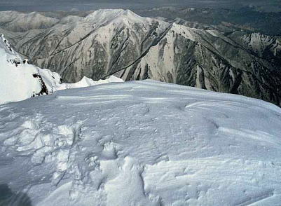 大倉尾根より武能岳枝尾根 10時半枝尾根に乗り.左へトラバース気味の所で昼食を摂る。温かさのない冷めた湯に塩けのない飯.食欲はありそうでない。 白樺の枝越えに対岸に聳える鋭い岳の斜面を覗き込みつつ食う。 谷間から一気に駆け上がる幽ノ沢.一ノ沢.マチガ沢の稜線が.岩稜が.そして雪稜が。谷川岳の双耳峰も望まれた。 反面.右側によれば柔らかい曲線を描く笹平の雪原や武能岳の眺めもここからは整い見応えがある。 尾根にでる 大倉尾根に乗ったのが正午.土合を出てから7時間の勘定だ。もう焦る気もなくなっている。 右側に雪庇を付けた夏径はやはり歩き易い。1500m左の尾根沿いに回り込む所まできた。 ここからは利根川下流の板東方面に冬晴れの切れ目が遠望できる。180度.頭を返せば武能岳にも陽が差しだしていた。 谷川東面の雪壁は時折.煌めき輝やいて望まれるも.生温い風が気に掛る。まずは頂まで行かねば。 頂.直下 高度1650m森林限界.這松帯に入る。クラストした雪面にツメが利きだすも束の間.頂を前にしてワッパは潜り始めている。 バランスを崩せば這松に足を取られ膝まで潜る。抜くのに一苦労し体力の消耗が甚だしい。 風が強くなってきた。頂まで後60mが如何にもならなず.万事休す一本取りツェルトを被る。 笠.頂稜へ |