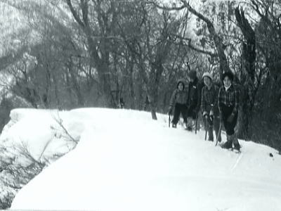 | 谷川岳.湿雪に挑む笠ヶ岳大倉尾根.s44年(1969年)12月06〜08日 L松村進(43年卒)m沼津久美子.桧垣いく子(3)中沢康.中西久美子(2) 土合―笠ヶ岳大倉尾根―白毛門―土合 谷川岳の国境稜線を分水嶺にして魚野川と利根川とを隔てる朝日岳から南方に延びる尾根上に笠ヶ岳.白毛門が聳えている。 この尾根は又利根川源流の支流宝川と湯檜曽川を隔て.西面支尾根は湯檜曽川に1000m以上の高度差を持ち没している。 尾根の距離は3〜4Km程と短く.湯檜曽川左岸の高度差も急激に落ち込む。その中.笠ヶ岳大倉尾根に目を向けてみた。 この時期になると過去に何度も.対岸の谷川岳西黒尾根から振り返り望いていた岳になる。 笠ヶ岳から西側に派生する尾根が大倉尾根で真っ直ぐ湯檜曽川に落ち込んでいる。尾根の背には谷川主壁が聳え.望みつつ登ることになる。 資料はない。上部は雪稜の尾根が続くが尾根末端取り付きの状況が解らず。費やす時間は雪被る藪に掛かっていた。 12月06日.上野22:12=2:47土合 湯檜曽川.取り付きへ 土合付近より茂倉岳 大倉尾根取付き地点より湯檜曽川上流12月07日曇後雨 土合一2:55山ノ家4:55一5:45マチガ沢:52一6:40幽ノ沢出合6:55一7:35芝倉沢出合先8:00一8:15湯檜曽川渡渉 華やかなロープウェイ広場はライトの光々とした照明に照らされ.初スキーを志すスキーヤーで満ち溢れていた。 生暖かい風が頬をなぜ.どんより霞む明け方の広場はまだ星が1つ2つ認められちる。 新道 「通行止め」と書かれた標識を越え.旧道から新道に入る。 凍り付いたジャリ道はランタンに照らされ.目立つガードレールの照り返しは冷たい感触の白光を放し反射させていた。 まだ明け方早く闇道に幻想じみた奇形を抱かせる影。ランタンはそのそれぞれの奇形な影を追ってもいる。 マチガ沢出合付近には幾つもテント,ツェルトが張られていた。テントのどれもが灯りを点け.アタックの準備をしているようだった。 東尾根を巻くと出会う人も疎らになり,更に一ノ倉への新道に出てからは数えるほどしかテントもなくなっている。 幾らか積雪も増し.ジープのタイヤらしい潰されたわだちの跡が.半ば積雪に埋もれて見留められている。 一ノ倉沢出合は夜明けを迎えようとしていた。白みだした台地はすっきりした明け方の兆候を示すのではなく, 不気味に感じるどんよりとした不安定な何時までも薄暗い重みを漂わしていた。天候は荒れるかも? 又周りは沢と云うより手前に屏風のような岩壁が扇状に広がり.薄暗さが顎の出るような岩壁が天を仰ぐが 如く圧倒させているよう聳えている。何故か鳥肌が立っている。 出合より堅炭岩幽ノ沢は一ノ沢に比べ.幾らか緩やかになると明け方の明るさを取り戻してきた。 そも顕著な岩稜が扇状に左右に落ち.幽ノ沢は隣りの一ノ倉沢とは又別の深みを持ち望まれる。 積雪が30〜40cmと増してきた。ジープにしては可笑しい.雪上車かと考え深げに.旧道に降りる。 出た所が虹芝寮.明るくなった空に堅炭岩の奇峰が聳え.足元は芝倉沢の広い出合へと続いている。 私達が目指すルートは笠ヶ岳大倉ルート.淡雪のラッセルを期待するも重い雪質が待ち構えていた。 湿気を十分に吸った雪粒が湯檜曽川の河原を埋め尽くしている。 |