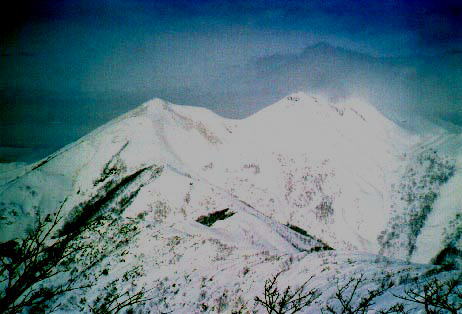 | 15:55笠ヶ岳一17:30森林限界上.アイゼン着一18:50小:55一20:25車道一20:35土合山ノ家. ヤッケを付け差し入れのケーキを食べ.一息入れてツエルトの外にでる。風速20mを越す烈風の南風が吹き付け.風に飛ばされつつ登る。 食いしばり続け.そして16時笠ヶ岳の頂に立つ。頂通過・・3等三角点標石あり.標高は2057.47m.基準点は「笠ヶ岳」. 10時間ものアルバイト.その報酬は握手さえできずにいる。上越特有の重い湿雪に馬鹿みたいな時間を費やしていた。 頬を打つ烈風がフードをばばたかせ.目と目を会わせるのが精一杯だった。風の息は全くなくなった。 もう崩れるのが分かり切っていた。雨雲に覆われ大気が大地に下りてくる。休むことなく頂を通過した。 笠ヶ岳より白毛門帳が降りる前に樹林帯に入ってしまわなければ.ビバークが待っている。 早い黄昏が早くも頂稜に迫り被いだしている。視界も途切れてきた。ガスの湧く中.焦らず止らず頑張らす。 そして幾つもの起伏を越え白毛門に立つ。 帳 時は乳白色のガスが包まれ.もう闇になっている。視界は完全に閉ざされた。 三度目に訪れた白毛門. 何時もガスか.闇に包まれていた。今回も周りは全て闇で閉ざされている。 樹林限界を目の前にワッパをアイゼンに変え.身を引き締めて.ランタンを頼りに雪稜を下る。 ビバークの不安は消えつつあるが現金にもので.今度は明日の仕事が気になりだした。 焦らぬよう焦らぬよう.スローなペースで緊張が緩まぬよう気を使い森林帯に向っている。 素手でも寒くない暖かさが最後まで続き.土合の灯を見出しホッとするも雨が降りだした。それからが長かった。 雪上で降雨に合うとは仕末が悪い。本降りになり雨に叩かれ.真下の土合はなかなか近づかなかった。 糠ずんだ雪層に雨が溜まり.滑る下りに傾斜は増している。闇は土合の灯をも包んで見られなくなった。 中西嬢の疲労は惨々たるもので.「もう否やだ!否やだ!」と独り言を言いながらカメのよう.這うよう降りて行く。 土合 土合橋に着いたのが20時25分。実に明け方から15時間半の行動になった。 久し振りの靴ズレに身を屈めながら「土合山ノ家」の湯舟に浸かる。 薄暗い風呂場と白い湯気.体の芯を暖める。トタンを叩く雨の音が.この湯殿まで激しく響いていた。 8日土合.最終夜行鈍行列車=上野 白毛門より笠ヶ岳と朝日岳疲労と根性で登った笠ヶ岳 中西嬢には慰労賞.パーテイーには功労賞を与えたい。 そして最後に誰もが疲れて切っている中.我々の乗る列車の為.寝ずに起きていてくれた沼津嬢に感謝の念を表したい。 その後笠ヶ岳山頂直下北側に笠ヶ岳避難小屋が建設された。高さ1.8m程の金属製,シングルウォールの小さな小屋. 木床で窓は4つで暗過ぎることはない。ただ換気口が付いているものの結露は激しいらしい。快適に宿泊するのは2名. 谷川山頂より朝日.笠ヶ岳大倉尾根 |