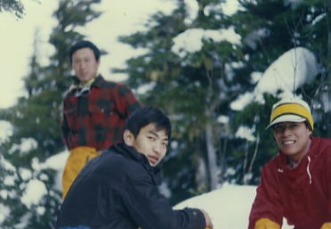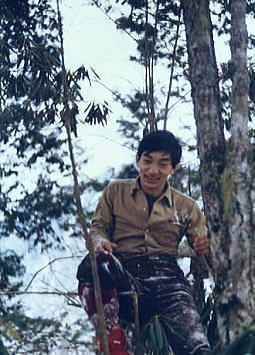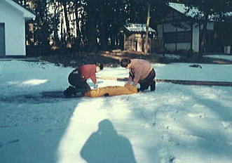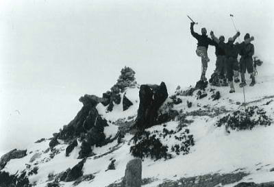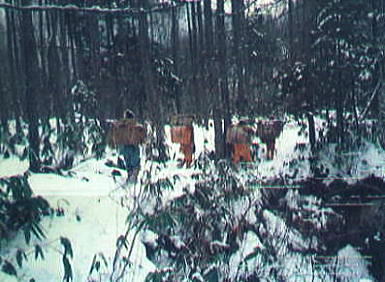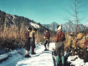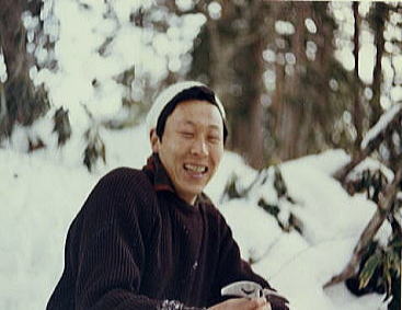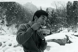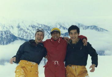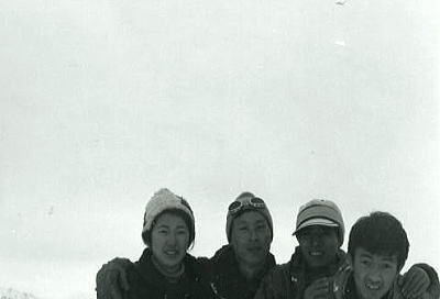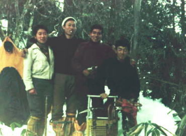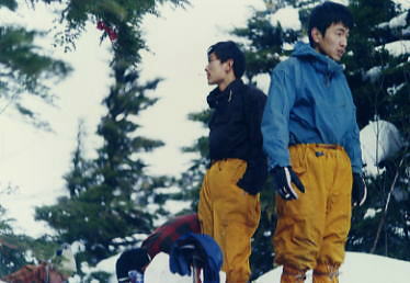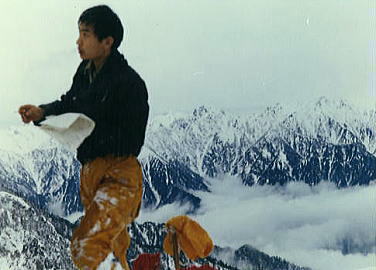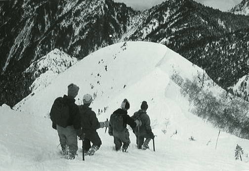 | 登り苦労したラッセルも下りとなれば早い。 尻セードは思いのほか,鈍い淡雪の流れを伴って下って行く。 もう早い帳りとの競争が始まっている。分岐前で遅い弁当を空けてもいた。 夕暮れから次第に闇の世界へと変わりつつある,雪稜をいいリズムで降りて行く。 街には灯りが点り一番星が現われた。今日も晴天が恵まれた。 ランタンに照らされたトレースは良き道案内を示し,歌まで出てきそうだった。そして,とうとう気間々に歌がでた。 Bc撤収風景 ![]() 1月03日小雪後曇 Bc4, 11:00一尾根取付11:50一11:50乳川谷12:30一13:30唐沢山分岐14:00一15:00西山神社:15 一15:25安曇沓掛=松本=辰野h5 霧氷 入山以来,暖かい夜が続いたが僕等の下山を祝すよう,ベースキャンプの周りは霧氷に被われた。 細かく細工された屑氷が枝木を透し煌いている。 山中.恵まれた天候が今,崩れだした。テントの外は誰もが驚嘆する美しく霧氷で飾り立てられ変わっている。 撤収が捗れば天気の変化も早く激しい。雪が舞い気を良くした僕等,樹林を縫い走るよう尻セードで滑り下りる。 重荷の尻セードはスリルがある。氷付いた雪面は又よく滑った。荷の重みにスピードが更に増すのも確かだが。 林間を抜い立木に抱き付き,時には誰もが前面衝突をしている。 停められぬ加速に奇声を上げ河原に降り立った。 河原にでてからは最後に山より危なかしい凍り付く林道がある。 下山 裾野に下る, 乳川.河原に出て1本西山の境内 河原には三日前のトレースが続いている。そして氷付いた林道は里まで続いていた。 新春を迎えた西山の神社には米や麦が奉えられ,社殿から神楽の唄えが境内に伝わっていた。 神前の洗水を受け顔を洗う,冷たい水が喉をうるおす。 僕等以外誰も居ない,この広い境内に田舎歌舞伎じみた曲だけが流れている。 そして境内は高い松林を抜って小雪が舞い降りた。 1月04日雪. 辰野h5=新宿 湯に浸かろうと辰野の宿で一夜を明かす。 朝.起きようかためらっていると一面の雪の世界に驚かされた。 寝床に潜る耳からタイヤチェンのガチャガチャいう音が響いてくる。又聞きながら寝込ろむ心地良さ。 漸く冬の気圧配置になった。事実.辰野では今冬.積雪量か最も多く,それから3日間降り続いている。 雪に埋もれる辰野の町.再び雪景色に見惚れながら中央東線の人となった。 エベレストの防寒具 明大.植村直己氏がエベレストに登頂する前に,偵察で着用していたキルデングを借りてきた。 見栄えは汚い。襟とは云わず袖も汗で黒光している。 正月.私が北アに入ると聞き,良いものがあると明大の同輩が持ってきた。 町では気が引けるキルデングも,山では凄い威力を発揮した。羽毛は軽く暖か過ぎる。下は薄いセイターでも汗を掻いた。 私は魔法のキルヂングを着ている。誰もがセーターを重ね着する中,肌着だけでも良さそうだった。 これだけ上等品を着ている者は今.アルプスで何人も居ないだろう。羽毛がこんなに暖かいとは。 入山二日目.もう仲間に分かってしまった。妬みより貸せ々と皆がうるさい。 皆が感心する素晴らしさがある。如何にも高価で手が出ない代物だった。 そして15年後.私は結婚し家族でキャンプの折,シュラフを3組新たに揃えた。 妻には羽毛のシュラフを子供達には化繊のものを。 当時でも羽毛のキルデングは市場に出たとは云え高価過ぎす一品だった。 今年の5月11日.植村氏は南東稜より日本人としてエベレストを初登頂した。日本山岳会 愉快な何時もの仲間達 焼津の富山先輩 マタの愛称を持つ田沼 頑張りやの沼津嬢 貪欲な後輩.中沢君 Bcにて正月の餓鬼岳 安雲野は、春を思わせる柔らかい陽差しの中に枯れていた。 暗緑色の樹林をまだらに見せた前山、真っ白い主稜、そこから伝わってくる大気はさすがに冷えびえとして、冬山であることを感じさせる。 そんな枯野の白く長いアプローチを,、きらきらと照り返す冬の光に目をしょぼかせながら黙々と足を運ぶ。 久し振りに背負う重荷が肩にくいこみ、たまらなく痛い。 しかし、以前からの憧れ、元旦に雪の山の中で迎えたいという,たわいのない憧れが、 一歩一歩現実になりつつあることの興奮のためか、自然と歩みが早くなることを禁じ得ない。 華やかな北アルプスの隅っこに追いやられ、ひっそりとそびえる人間の臭いの薄い静かな山。 そんなガイドブックの文章に、僕自信を見つけ出し、以前から一度は登らなければいかんと思っていた餓鬼岳。 11月も終わりの頃、ObのMさんから誘われると何のためらいも無く、行くことを決めてしまった。 頂上アタック。その日は一日中,重苦しい灰色の空であった。 起床が大分予定とり遅れてしまったので、雑煮をかき込み、早々にテントを出発する。 前にパーティが入って入るらしくトレースがあったので、これを利用。分岐までは楽々と行くことが出来た。 そので前のパーティに追いつき、ラッセルを変るべく完全装備。 やはり冬山に来たからにはラッセルしなくては。 「雪のついていない山なんて・・・・」とに