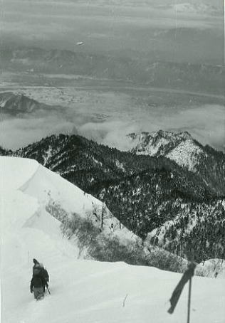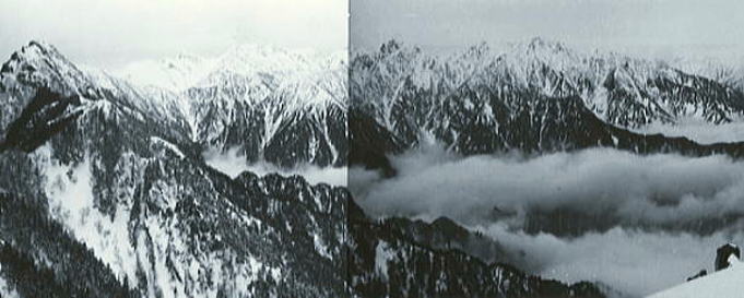 天と仲間達 ![]() 餓鬼山頂.仲間達 沼津嬢.田沼.富山先輩と若き中沢君 ![]() 山頂肩より唐沢岳と後立山連峰南部.船窪山群 五色岳と立山連峰 東沢乗越から燕岳群望む 翌年の正月を狙い岳を見る。ボケているが目は真面目雪稜 後立山の頂嶺に蓮華の長い尾根 そして船窪岳は針ノ木岳の交差した白峯が。その左より広い大きな山容は立山に連なっている。 大きく一ノ越のくびれが望まれ,柔らかく純白をめとった浄土岳,更に鬼ヶ岳へと延びている。 剣御殿が神座なら手近な所に唐沢岳の側壁がきわだって我を振るっていた。 頂へ500m.彼等に先行を譲り,左に大きく張り出した雪庇を横目に,広く開けた眺望を楽しむ。 風で雪質は締り足元から葛雪が滝沢へ転がり落ちて行く。 槍ヶ岳は日本に存在する限り,やはり北アルプスを象徴するよう聳えている。頂に立ってまず鋭い穂先の槍が眼に入る。 はっきり右裾に小槍を構え素晴らしい山容を誇っていた。 下山,安雲平へ |