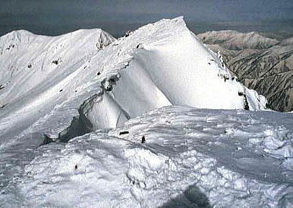 | 国境稜線 時間はまだ早い.天気も抜群によく.途中で会うだろうと腰を上げる。 オキノ耳を過ぎると国境稜線は人気もなく.僕等だけの山を更に強めている。頂より一歩でるとトレースはなくなった。 雪稜に足を踏み込めば程良いラッセルに綺麗なトレースが煌き築かれて行く。 心を踊らせ湧く々する気を押さ押さえ頂稜を歩んでいる。 足元の右下に切れ落ちる崖の壁下は湯檜曽川まで落ち.魔の山と称する岩場を構成していた。 そして左側に広がる魚野川源流の緩い斜面が国境稜線を非対称的な山稜に変えている。 谷川岳から茂倉岳にかけ雪庇を避けて.万太郎側の雪潜る這松帯を歩む。 雪の被る這松帯は時には足を這松の空間に突っ込ませ,膝まで潜らせた。 そして腐りかけた雪質はもうダンゴになりがちとなる。時折ピッケルを振い落とした。 風の道 茂倉の頂付近には風の通り道がある。 無風に近い稜線はそこで急に茂倉谷から這い登る強風にあおられた。 息のない烈風は30mを越すだろうか? マタがピッケルを雪面に差し.ぴったり停まった。 真ともに受ける風は頬を打ち.袖をバタバタさしている。 風道にマタが何時までも立った間々でいた。 先輩が怒鳴り歩きだしものの,風道は巾10mたらずのものだった。 それにしても過ぎれば凪のようなる。狐に馬鹿されているようだった。 巾の広くなった笹平の稜線は尻餅をついても落ちる心配はないが,それより足元のダンゴに苦労する。 雲1つない西の空,遥か彼方.南面に積雲のような浮き雲を見出した。笹平である。 雪堤 武能岳でスキーのシュプールを見付ける。 雪庇すれすれを走っている。新津さんだ。仲間のシュプールに間違いない。 仲間と会うことを楽しみにした数分後. 驚く程の早さで雲の一線が築かれ.湧く雪雲に堤は我々に迫りつつある。 見る間に近ずく雪堰の迫力は凄い。 もう知らぬ間に碧空は失われ.雲の切れ目どころか視界は途切れ.厚い雲に被われた。 頬を撫ぜたと思われた風も強さを増し.一瞬にして荒れだしている。 それからは蓬峠まで天気との競争になった。ボンボン下る。そして雲堤はどんどん近ずいた。 崩れるのがこれ程早いとは。小屋前に立ち止まった時.周りは暗がり風と共に雪粒が降りだした。 それも叩くような吹雪に変わる。 蓬峠.蓬小屋 |