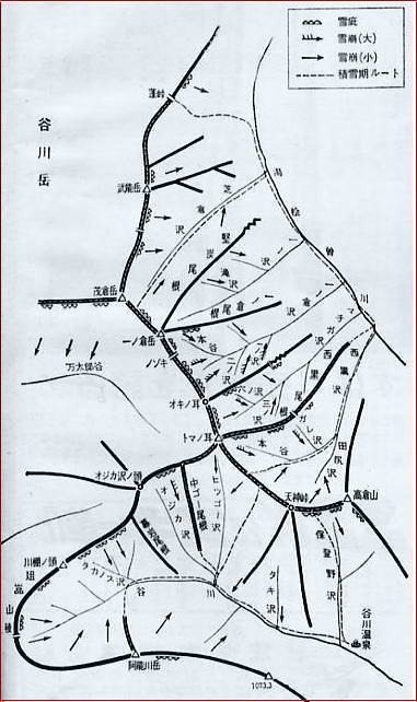 | 天候急変した上越国境稜線 s40年(1965年)12月11〜12日. L田中正幸(3).m松村進.田沼栄一.三浦俊彦(1) 木曽御岳山で冬山の良さに惹かれた僕は月を改め再び上越国境の雪山.谷川岳に出向く。 次の週末には仲間3パーティが谷川岳周辺に入る。 既に初滑りを目論む谷川岳天神へは林さん等.女子パーティが入り,男子パーティは蓬峠に宿り,山ツァーに入っている。 それではと冬山初めての上越国境越えてで.蓬パーティとは谷川山の頂で出会う手筈になっていた。 西黒尾根―谷川岳―武能岳―蓬峠―土樽 土合 雨が降る東京を発った列車は土合駅ホームに入線すると星屑の散りばめられた夜空に迎ええられた。 谷間一杯に星群が扇状に広がり.ホームに立つと寝不足の体に冷たい山気が身を震い起こされていた。 ロープウェイの駅広場には,今だ動かぬロープウェイに長いスキーヤーの列が続き,気の早い者は人の間を縫い滑っている。 林先輩を探して見たものの余りの人の多さで分からなかった。 西黒尾根 |