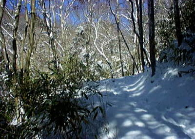 | 雪の峰々 振り返ると峠への沢が眼下を走り.その先に魚野川の広い雪原が広がっている。バックには飯士山.無黒山.大源の山々が。 その奥には米子ノ頭.柄沢山と坦々とコブが続き.一段白く輝くジャンクションのコブは遠く朝日岳の雪稜へと連なっている。 背稜をなす巻機山から谷川岳に掛けての雪稜が繋がり.巻機山の頂に突き上げる米子.割引の沢も望められた。 広大な頂からスキーを満喫し.風切り滑るのも面白い。2年前になるがクラブの執行部になり.後輩達を連れて巻機山に登っている。 あの時は親父さんが熊を捕らえ.結わいだと延々と熊鍋の御馳走になっている。凄く強い悪で食べてニンニクと同じだと知る。 千曲川へは朝早めに石打を発てば峠越えも可能のようだ。 積雪に閉ざされた孤高の集落,倉下.土倉に立ち寄り.中津川から長い十日町まで下るのもよい。ただ豪雪地帯で間々ならぬだろう。 十二峠 十二峠は半ば樹林に被われ.陽射しは疎らに透す所もあるが閉ざされがちだった。 峠中央には太い幹の立木がそそり立ち.向かいに地元の信仰心を注る山の神の小さな祠が拝られている。 そして集荷所のような大きな小屋がある。ワッパ跡はなだらかな樹林帯を縫うよう,倉下へと下りていた。 炭小屋 小屋の戸を引き開けると中は薄暗く索漠としていた。一瞬真暗闇に見えた小屋に目が慣れると全体像が分かるようなる。 倉下の集落から荷上げたと思われる炭俵が3つ入口の向かいに置かれ.少し離れた所に.別の大きな炭俵がある。 そして小屋の中央には吹雪の峠越えで休む村人の為に.焚火の跡が何度もされた形で残されていた。 西寄りの板塀には吹き込んだ雪がうず高く積り.そこだけは白く寒さを注っていた。 サブザックから新聞紙を取り出し.火を投げると湿気を帯びた燃え掛けの薪はよく燃えた。 小さな焚火に暖かみを生み.昇る煙が激しく小屋内を充満させてだした。 明かり取る為.ちょっと開けると戸口で.忍び込む風と気流を乱し.じゃれあって渦となり消えて行く。 過って単独行を誇った加藤文太郎が吹雪の中で.新しいエンジンのノズルを見出していおる。その本の綴りを想いだしていた。 滑降 小屋で暖かみを取り腹を満たし峠口に戻っている。沢口を正面に向かいに聳える巻機の山々は既に霞が掛かり薄く消え掛かっている。 それに比べ峠の森から下る雪斜面は陽射しをまともに受け.雪面を鏡のよう反射させ白銀を散りばめていた。 眩しい輝きはサングラスを掛けれも強い。その陽光が体をも温めている。小屋の中とは別世界にいるようだった。 シールを除くと真新しいヒッコリー板の初滑降が始まった。充分にワックスを塗ったテールはよく滑り.又よく雪面を刺した。 滑降ならぬ滑行 眩い斜面が窪地へスキー板を誘い込み.トップを雪面深く潜らす。そしてその後にくる転倒は体を雪の中にバラ撒き散らかした。 袖口と云わず口も耳も雪に被われ.吐く息も雪の粒が舞う。 それでもトラバースするが如く斜滑降を描く転倒は.体を谷側に一回転させている。 空中を飛んだスキーは谷側に落ち.旨く着地すれば又滑りだす。それ故転んだ気を起こさせず。 そして再び.それから斜滑降の絵を描きだす。 後を続く沼津も同じよう苦戦している。特に重い雪の場合で眩いばかりの雪面が広がっている場所は谷底へ真直ぐ滑る方がよい。 度胸はいるが目の前にしか現れない雪の起伏も見事飛び越えられる。 そして窪地も重い雪の時は躊躇せずジャンプで越せばよい。雪のバライテーな変化にスピードが伴い快い。 タイミングさえ合えば.素晴らしい滑行となるが時として派手にどんじることもある。 雪里 左岸,林を抜ける手前で僕の滑行に気が付いてキジが雪割れの笹目から跳び出した。 朝方の同じ所から飛び上がったところを看ると,キジの巣があるようだ。 朝にはなかった雪原を切る沢の瀬々らぎ.そして対岸に出ると朝方の雪のトンネルにでる。 雑貨屋 朝方は分からなかったが道路沿いにぽつんと雑貨屋が店を開いていた。何もない所に一軒の雑貨屋が目に付く。 登りの途中では分からなかった場所だった。この下先に上野の鉱泉がある。 峠越えし一休むにはよい場所だった。茶をすすり上野の集落へ用達する前の休み場ともなっている。 棚に質素な食料品が並んでいた。午後のどんより霞始めた空の下.サイダーを手に取る。 ここは積雪多く車の通れぬ道だった。無雪期には峠越し中里村へ結ばれているのだろう。 ワッパの跡はあるものの通う人も居ず.スキーを道脇に立て喉を潤す。食道を抜けていく冷たさが快い。もう直ぐ街にでる。 何処にでもある普通の峠径,地元の人の苦労をよそに.雪に覆われただけで私には長閑な風情に見えた。 歩むのみの峠道。足で稼ぐだけの峠越えだからこそ魅了させられている。 今日一日の満足感を頂き雪国のよさを改めて知らされる。 彼女も,その一部でも味わってもらえただどうか? 後は上越本線のガードまで雪径を頼りに滑り込めばよかった。 霞みだした上野の集落