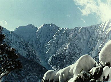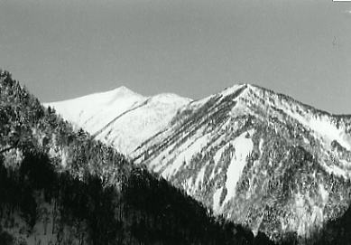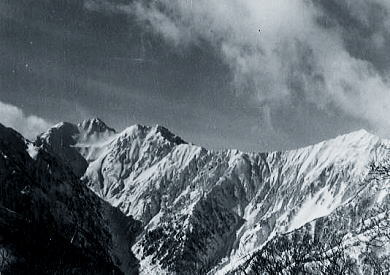 | K四ダム専用道路 荷台から仰ぐ紺碧の天空と白銀に被われた裾野を綴る雪道. 今年も晴れ晴れとし過ぎるほどの好天に恵まれていた。 大町駅からお願いしたトラックの荷台に乗せられ.私道の黒四専用道路を走り.終点のK四大町隧道の起点まで運ばれる。 荷台は朝方の強い陽差しを浴びながら.ほほを打つ風は凍り付くほど冷たく.道路沿いは新雪が煌めき.眩い過ぎるほど明るい。 反面.着いた隧道を覗き込むと坑内は暗く.路面はツルツルに氷り付き.会話はコダマし,ダムの坑道内へ伝わっていた。 入口には「通行止」の鞍もなければ塞ぐ柵もなく.隧道口には何の印も看板もない。 ただ隧道入口の明るさも.覗き込むトンネル奥の穴先は真っ暗な闇の中。抜けると黒部湖にでる。 黒四ダムの完成1年後.昭和39年8月に中部山岳国立公園内を走行することに配慮した.排気ガスを出さないトロリーバスで営業を開始している。 それなのに冬期はぶっきら棒のほど何もない所だった。関西電力の専用道路と繋がっているためだろうが? 誰も来ないことを前提にしていた。 許可を貰い.ここの隧道に入り込めば.何の苦労することもなくアルプスの真ん中.黒四ダムの堤頂に出られる。その警備も全く見られなかった。 この時期に籠川源流周辺に入り込む登山者は稀. 北アルプスでも上高地に入ることとは全く異にしていた。 3年前には全山縦走した折.一度黒部川に下りている。その折黒四ダムの堰高にでるために左岸から抗内に入り.迷い放流口に出てしまった。 坑内は蜘蛛の巣の如く坑道が複雑に絡み合い.焦るも坑員に会うまでは迷い続けた想いがある。 籠川谷には何処の雪稜に入るにも黒四専用道路を利用し入山する。だが我々以外利用する登山者は稀のようだった。 籠川谷はその後は数年.正月のこの時期に入山するも.他の登山者を見たのは今回一度だけだった。 好天が続けば下山まで自分のトレースが崩れず残る日々が続いていた。正月の籠川谷は常に我々が独占していたことになる。 間違い 何を勘違いしたのか車は籠川の隧道口まで入ってしまった。荷台に乗り運転手に伝えられなかった。時間をロスし扇沢出合まで戻っている。 下る専用道路はここまでは除雪され,雪を吹き飛ばし.路面は氷り付いていた。取付きまで重荷は雪道以上に滑る。 そして南尾根末端.扇沢出合寄りの左尾根から取付いた。 何時もの仲間が集まっている。マタを頭に卒業してからの後輩.八端君に紅一点の沼津嬢も居いる。 彼女の山に対する志には何時も感心させられている。素晴らしいファイトの持ち主だ。 尾根の取付きは何処も傾斜も強く.馬力がいた。先行パーティに助けられるも急斜面では楽とは言えずラッセルの淡雪を更に漕ぐ。 本尾根に乗るも眺望も何もない。樹林に被さる積雪に雪面を切り.ラッセルを繰り返し前進するのみ。 馬力がいた。休む安らぎさを求めての動作。 繰り返さる我慢の登りが続く。 途中で先行パーティが早くも先の台地で天張っていた。今日は大晦日.我々はもう少し頑張り.3時間ほどの高度1310mの台地に天張る。 ここから先.爺ケ岳へのルートが続くが.時間は充分にある。 樹間を透し星が輝きだしている。 6人天,広いテントの居心地も良い。今年も来た。山へのフャイトが改めて湧きだし始めていた。 爺ヶ岳南峰と主峰 ジャンクションより12月31日.晴後曇 1310m地点c1. 9:45一10:20(小伐採斜面.雪原状):32一11:20樹林帯:35一12:25小:35一13:40小14:00 一14:55ジャンクション.ピークbc2.3 後立を目差す 深い樹林帯に入る。初めから急登.潅木と深い積雪が登行を拒み.体力は激しく消耗するが気は勝っていた。 早めに発った先行パーティに助けられ.ラッセルは思いの他,楽になる。 高度を見る見る稼ぎ.灌木は低く雪に覆われ,視界が幾らか利きだした。 強い陽差しと眩い雪面の反射が足元に広がり,吐く息との歩調は全員に上手く噛み合っている。 垂れる汗も清々しく.休む1本が快い。雪山に入る喜びと正月を山で迎える楽しみで.暮れからくすぶり続けていた体に,気は踊っていた。 ここを抜ければジャンクションの森林限界にでる。 ベースを設け仲間と年越しの山を味わおう。雪稜は目の前にあり.開かれていた。 ジャンクションc2.頂へ Bcからアタック |