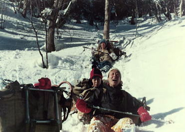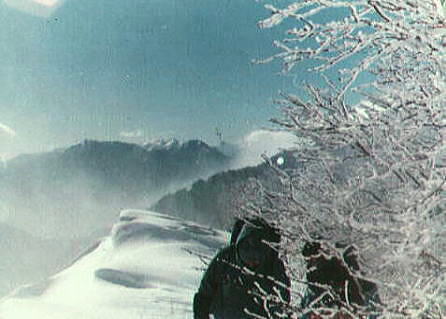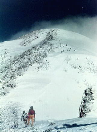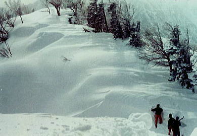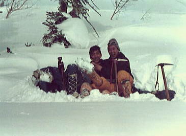 | ピッケル紛失 ラストを滑る私.ピッケルはザックに確り縛り付けたつもりが無くなっていた。 何度も尻セードをし何処かで枝に引っ掛けたようだ。ラストで余計分からない。 戻り探すか? シモン・スーパーD(特殊鋼)を紛失する。一番貴重な山道具を失うことになった。 s41年(1966年)に池袋「山幸」で中学.高校時代に貯めたお金を費やし注文購入した。 シャモニーの近くにあるシモン工場での手造り。シモンの創設者「スルーゼス・シモン」の頭文字をとっている。 s44年08月には剣岳長次郎雪渓で滑落確保.シャフトを折り修理している。 45年01月の紛失まで.まだ山へ20回程しか共にできなかったピッケルである。 その後,懐は常に底をついていた。秋葉原「ニッピン」で当時一番安価なエバニュー製のピッケルを購入した。 沼津嬢.八端君と私とマタ , |