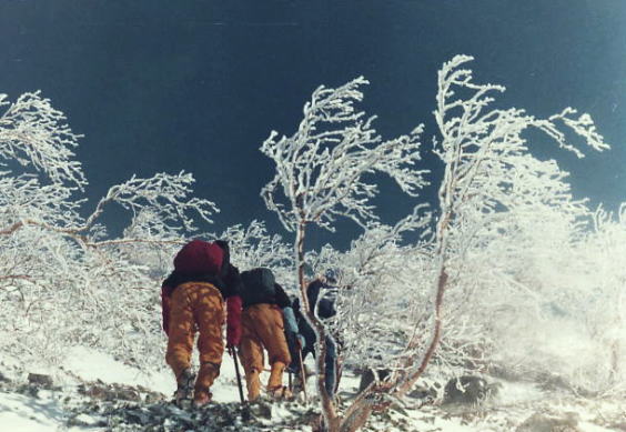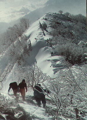 扇沢から白銀輝く後立爺ヶ岳南尾根. s45年(1970年)12月30〜01月03日 L松村進sL田沼栄一(43卒)m沼津久美子(文4)八端憲明(法1) 後立山連峰 昨年の正月に初めて北アルプスに入り餓鬼ケ岳南尾根をピストンしている。それに続く岳として後立山連峰に目を向けるようなった。 籠川流域に入る。 卒業後は後立山連峰の東面.籠川流域の左岸尾根沿いが冬山の中心になると心に思っていた。 その概念を肌で知るべき卒業年度の晩秋に白馬岳大雪渓から蓮華岳の縦走を行い.針ノ木雪渓を下りている。 又昨年は卒業式を迎え.式当日に学割を利用し.明大の幼馴染と雪洞を使い.鹿島から爺ケ岳東尾根に入山。 酔いどれ山行だったがその時の利点を生かし.まずは後立山連峰の爺ケ岳南尾根から挑むことにした。 天候と雪質の好条件に恵まれ楽しくトレースできている。 初めは尾根末端,取付にベースを設け,ポーラー形式を取る企画を立てたが欠員がでて止めたのが幸いした。 新人.女子を含め4名で構成されたパーティ. この尾根は危険なポイントもなく.ポーラーの必要もなく惰性の如く登れた尾根だった。 爺ケ岳の頂に立っている。冬山だけの素晴らしい眺望に.スムーズに行き過ぎた行程. 再び訪れたい願望に包まれてもいた。 岩小屋沢に突き上げる赤岩尾根やポーラー形式で.蓮華岳南尾根から針ノ木岳ピストンする案も面白かろう。