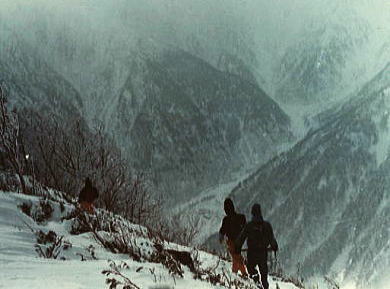 アタックを終え 籠沢谷と早い谷間の帳Bcへ 湧き出したガスは急に明るさだけでなく.気温をも落している。頂は黄昏へと見る見る走りだしていた。 霞の掛かってきたガスの切れ目から山里がまだちらっと望まれた。我々も今日の凱歌に酔い頂を離れる。 頂稜を離れると雪稜は雪の庇を大きく東側の谷へ広げ構えていた。 登りのトレースを外さぬよう気を配り.帳の落ちるルートを探る。もうこの時期の日は早く闇が迫っていた。 1泊,泊まっただけのBcも.見付けると我が家に帰ったような安堵感に襲われた。そしてジワジワと悦びの気持ちが湧きあがる。 愛着漂うテントがぽつんとジャンクションにあるのを見出した。 Bcへ |