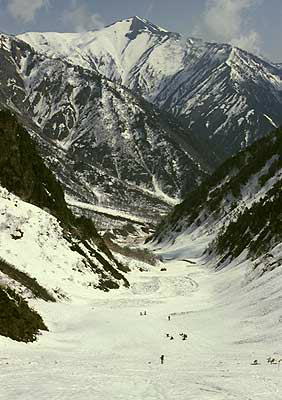 | 撤収 入山以来好天に恵まれ強い照り返しは鏡のような陽差しを受けての撤収になる。 下山 ![]() 赤沢岳.鳴沢岳.岩小屋沢岳 樹間を抜け裾野へ 樹間から望む赤沢岳.鳴沢岳.岩小屋沢岳鳴沢岳はツメでs48年登頂を断念している 下山は尻セードで潅木帯に入っても明るい斜面.雪の白さが眩い。 キスリングを背負っての尻セード.強引な滑りに高度は一挙に下げる。 荷の重みがスピードを上げ歓喜を上げて落ちて行く。.淡雪が舞い顔を体を泡だらけにした。 針ノ木岳〜赤沢岳 |