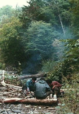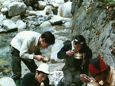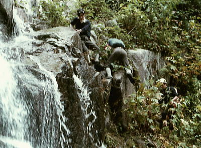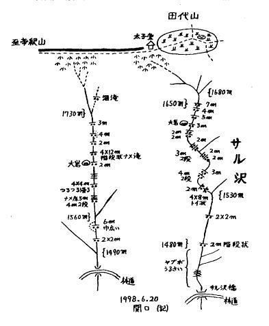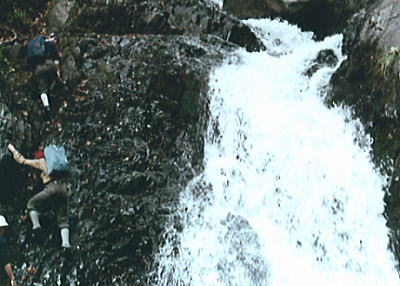 | スリ沢出合.小さなゴルジュ,の滝に掛かる。倒木が滝口を塞ぎ.小さいと云うものの釜を持っていた。 滝口に倒れた巨木に跨って摺り上がる。摺り上がる程でもないが変化を作るポイントとして.後輩達ははしゃいでいた。 サル沢 帝釈山から田代山にツメを変更.無名沢を詰める積もりが.見落としてしまったらしい。 左岸に落ち込む荒れた沢に回り込んでみたが.無名沢らしくない。 戻るより登れとサル沢の裏側の太子堂に突き上げるサル沢左俣を詰めることにした。 昼食 11時半.三段ノ滝下で昼食。先程採った茸を混ぜ山菜うどんを作り食べる。皆よく食べる中.1年の和泉君はまだむしゃらな調子がなかった。 夏合宿を終えたとは云え.まだちょっと山への呑み込みが足りないようだ。 同期の居ない初めての沢登り.昨夜の車酔いをし.まだ覚めながいのか覇気が欠けていた。 秋田出身と云えば最近一緒に山行を共にする八端君と同郷だ。私がOBになってからの後輩.まだ可愛さが残っている。 サル沢左から源流へ |