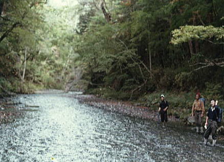 | 10月25日.東武浅草17:10=19:37鬼怒川.東武バス=20:05川治.雨:45.白タ=20:40無砂谷大橋一23:35ハタノ沢出合先b1. 白タク 川治に着いたのが午後8時.もう最終路線バスはない。川俣上流まで入ることを条件に白タクを頼む。 川治では小雨が降り注いでいたものの黒部.栗山と奥へ導かれ.川俣を過ぎると路面は乾いていた。 闇に包まれた田舎道.長い鬼怒川沿いの地方道(川俣温泉川治線)が続いている。 舗装は直ぐ途切れ.ヘッドライトの灯だけが裸土の先を導いている。 今夜は雨覚悟の野宿を考えていたが運転手が薦めてくれた飯場にお世話になろうとと案じていた。 それも運よく奥に入るにつれ路面は乾き.状況はすっかり変わっていた。闇に中.気は揚々と晴れ上がる。 暫くして闇から急にスポットライトを浴びたような明るい場所にでる。程長い間隔で光る蛍光灯の灯りが川俣大橋を浮き出している。 この橋を渡ると念願の馬坂林道へ。川俣湖左岸の林道は路面の凸凹が激しく.車はうねり腰を踊らせながら北上した。 登るツヅラ道にライトの光は更に踊り視野を狭めて行く。 運転手は初めての道.「遠い!遠い!」を連発しながら,おだでにおだて,とうとう川俣から奥の沢まで入って頂いた。 ここは途中飯場で教えて頂いた3本目の橋.無砂谷橋まで入ることができた。 Bsへ闇の道 早々.エレキが頼りの歩行になる。車が去ると厚い雲が谷間を閉ざし.真っ暗闇の道が続いている。 晴れていても上弦の月.月あたりは望めなかっただろう。それにしても闇に包まれた黒い道。 右に折れ,頭のエレキを頼りに歩むも.灯りは足元だけの小さな空間だけを照らしだしていた。 この先にも飯場はあった。犬.2頭の怒声にビクビクしながら,まだ続く林道を20分程歩いて.右に折れ溝沢を横切ってハタノ沢にでる。 そして林道が馬坂川本流を横切る地点で沢底に下りた。 1寸先の明るみもなく.全てが闇に包まれている。皆でエレキの灯を集め.河原にビバーク地点を見い出した。 橋より100m程遡った左岸の砂地に野宿する。見上がると時折望めるか,望めぬほどの星が1つ.2つ見付けられた。 真っ暗闇の渓谷で.如何にか雨だけは気にする必要がなくなっていた。 延々と続く平瀬の川 |