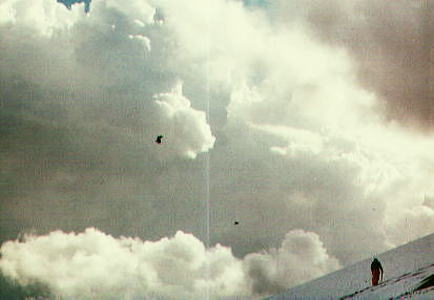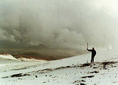 大砂走で.大川は私の山スタイルをそのまま装っている初冬の御殿場. s46年(1971年)11月.m大川.田沼.松村 どうしようもない仲間 富士山へ雪を踏みに行こうとマタが我が家にきた。大川は屋根裏から私の防寒具を持ち出している。 私はピッケル1本持ち車に乗り込んだ。 愉快な仲間 マタは山へ登るつもりでザックに冬山装備を詰め込んで我が家に来た。 大川は背広で現れ.私の山道具を自ら漁っている。シャツ以外全て私のものである。 二人とも雪があれば良いと。結局.でかい斜面を持つ富士御殿場で選ぶ。 残雪は新二合目を越えると現れ.誰も居ない昔のスキー場はリフトもなければ看板もない。 縺れる足で須走りへ。大斜面が広がり.その上に馬鹿でかい雄大積雲が湧き上がっている。 その中へ雄大な斜面に向かいマタは歩きだし.どんどん小さくなって行く。 大川も別の雪斜面を歩みだしていた。 雲の切れ目 重なり絡み合う雲の渦が切れ.漏れた陽差しが雪面を照らし始めている。 差す陽差し.白光の帯状の線が大地に照り付けると.其処に天と地の境が見られるようなる。 境その1点から陽光の点を生み.輪の広がりが.蒼空をも生み.我が頭上に照らしだでした。 自然の超越した力が浮き雲の如く現れ.我々を被い周りを照らし始めている。 神々が大地に降りるよう。その神秘さを私は感じさせさせていた。暖かい陽差しが更に体を喜び振えている。 s46年秋.ピッケル(炭素鋼)購入 富士山.御殿場 |