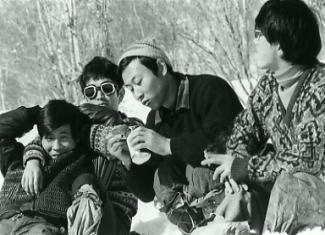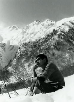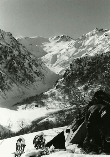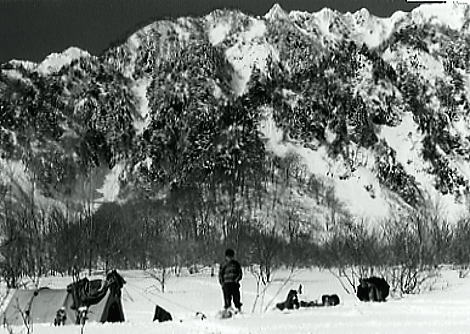 | 1月02日小雪.停滞・・籠川Bc 登頂を終えての停滞 帰京できる雪原で雪の中に留まる。外は小雪が舞っている。吹雪けば下山しただろうが留まっている。 目的もなくテントでゴロゴロしていた。何にすることもなく雑談に花を咲かせ.呑んでは騒いだ。 1月03日快晴. 半停滞と撤収 今年の正月はここ籠川谷に我々以外誰も入らなかった。 誰一人踏まれずして残るトレース。広い大地を占領して下山の一時を楽しむ。 昼寝 濡れた物を干す者,マットを出し日向ぼっ子に奄出す者.のんびりした撤収が始まった。 暫く私は昼寝をする。 テントに入り雑然と散らばる物を押し分け.シュラフに足を突っ込む。 目を瞑っても明るい陽差しが黄色い天幕を透し,天幕内をも黄色く明るらめている。 明らむ瞳.明るさが却って居心地よさを生んでいた。 温室になったテントの温もりが何とも云えず.眠る気もなく.つぶる瞼に適当な疲労感に酔っている。 外では雑談する仲間の笑い声が聞え.のどかな安らぎが私の耳にも伝わっていた。一時眠ったようだ。 「撤収!」の声で起こされる。4.50分だが清々しい目覚めを迎えた。 ベースキャンプの仲間 |