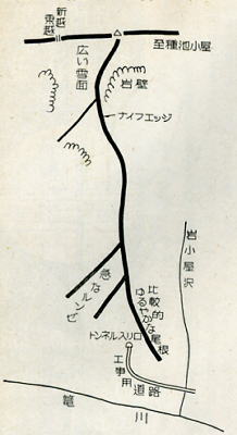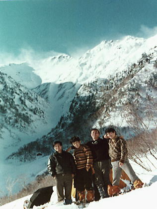 | 再び正月の後立山.岩小屋沢岳 s46年(1971年)12月30日〜01月03日 L松村進(43卒)sL新津賢(40卒)m田沼栄一(43卒)中沢康.内海勉(4) 昨年の正月は後立.爺ケ岳南尾根に登っている。今回はその左隣りの西側に当たる岩小屋沢岳岩小屋沢尾根に入る。 ここ2年は他パーティと交互に登る山行になったが今回は籠沢に入ったのは我々のパーティだけだった。尾根末端台地にベースを設ける。 今回は又新津先輩を迎え.現役の負担が多くなることから午前中に東京を発ち.現地で買出しをすることにした。 そしてその日の内に籠川谷にベースキャンプを設ける計画を立てたが大変な事態に持ち込まれていた。 12月30日快晴・・待ちに待った後輩 早朝の出発が遅れること10時間あまり.杜撰な集合となる。 年末の仕事に区切りが付かず.駅で待っている現役中沢君・内海君に悪いが遅れることを告げる。 発車時間には間に合うと。 新宿駅で驚く。 後から新宿駅ホームに集合した私も,云う言葉を失った。信じられぬことが起きていた。 私が最後だと思っていた新宿駅出発ホーム.その後後輩からの連絡もなかった。 何を勘違いしたのか? 新宿のホームには同輩,先輩が居ず,待合せ時間は過ぎていた。 まだ在宅中のマタを熊谷から呼び出し,新津さんを迎えた。 意味も分からず時間だけが無意味に過ぎていた。勘違いも有り得るが現実のものになっている。 何も言わぬ後輩に私は頭が上がらなかった。何故連絡をしなかったか正すも,私の言葉も弱い。 初めてのこと,新宿駅ホームに全員が集合したのは午後4時を過ぎていた。 狐に包まれたようで如何にしたことか? 念を押した列車時間を共に12時間.勘違いしたらしい。午前と午後,喋る言葉もなく謝る友。後輩は無言でいる。 学生最後の山へと張り切っていた後輩達に.私も無言で見詰める以外なかった。 兎も角.列車に乗り込んだ。故30日は松本泊りになる。 岩小屋沢尾根
