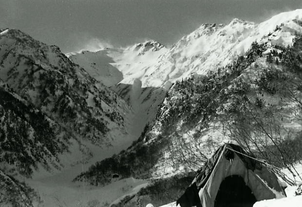 鳴沢の山ヒダBcテント 雪原にランタンが点る。 陰る山間に闇のスカイラインが描かれ.おぼろな星空との境が谷間に築かれていた。 ベンチレターから覗く針ノ木岳の真上高く星が煌いている。 私は壷足に両手を突っ込み,外へでる。 大晦日今年も後立に来た。闇に包まれたラッセル跡も固まり.山風が谷へ冷たく流れ込んでいる。 この広い谷に築いたトレースは今年も我々だけのようだ。 友の影が明るいテントに映り.その周りだけを積雪で浮き上らしている。皆の笑い声が聞こえていた。 身震いしながら小キジを打ち.私も首を屈め早々にテントに飛び込む。 |