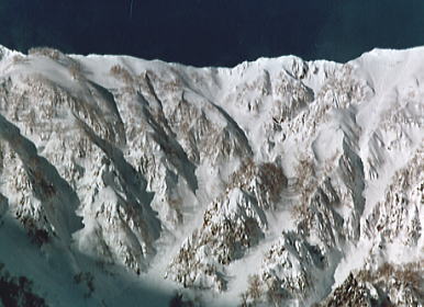 | アタック 尾根の取付点は左側の沢を詰め雪積るルンゼを詰める。尾根の下半分は緩やかで,上部は大分急な斜面になるが難しさはない。 主稜直下の痩せた尾根に続く岩小屋沢側は岩壁で抉り落ちている。鹿尾根側の雪の広い緩やかな斜面の主稜にでる。 岩小屋沢岳山頂 暑さと汗でラッセルが快い。傾斜は益々増し.最後の雪壁を越すと頭上は紺碧の空が広がる。 昨年もそうだった。快晴に恵まれた岳を望み,汗を掻きあげて頂に挑んでいた。 蒼き天と白き峰を迎え心に身振りを起こしていた。。不安ではなく頂稜を見ての武者振い。今年も後立.隣り岩小屋沢の岳に立つ。 頂稜では風を避けツエルトを被れば暖かった。 眼前に白さを強調するかのよう岳々が飛び込み.眩い白稜が紺碧の空との境を築いている。 後立に始まり剣岳から南下して槍ノ穂先までアルプス全山が望められた。 眼下に籠川谷の雪原が眩い白さで煌めいている。 針ノ木岳から続く奥深い谷は扇状に広がり.照り付ける雪面に煌めき輝く明るさを照り返している。 強い陽差はゴーグルを通しても.きつい。 トレース 今,雪壁を崩し別け登って来たトレースが足元から雪の壁を越え.雪稜から籠川谷の雪原へと延びている。 昨日.谷間へ入ったトレースも,その間々一本の径として.この頂まで綴られていた。 この広いカールに我々だけの.たった一本のトレースが覗まれる。 蟻の道のよう思えるトレース 自然の大きさに.自分が如何に小さく果かないかを思い.黙々ラッセルした頂に恋しく凄くも思えた。 蟻が這うように這い登り作ったラッセル跡。私はその頂点にいる。 針ノ木谷を詰めた雪稜はその上に更に幾つも頂を乗せ.頂稜が紺碧の空に抜けるよう突き上げ連なっている。 槍穂の岳を望み.峰々が要塞の如く山塊を築き広がってもいた。 この数年.新年は好天に恵まれ.冬山の良さばかり感じ取っていた。 |