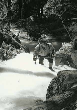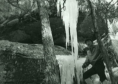 日没近く後を考える大日岩より瑞牆山荘へ 大日岩15:45b1. 16:03一16:18大日小屋:23一16:33小:41一17:21富士見平:35一18:00瑞牆山荘hc. 小屋探し 連休で大日小屋には小屋番が入っている。がっかりして.その下の富士見平へ下る。 朝方炊事の折.三浦がコッヘル一杯の湯を僕のシュラフに不注意に掛けてしまっていた。 それ故.今夜は小屋に泊る以外なかった。時間はある。無人小屋を探すことにした。 瑞牆山荘で憩う富士見平小屋を覗くとハイカーが.肩を寄せ合い炊事に精をだしていた。 夕昏近く薄ぐらくなった土間では人の波で埋り.コンロの響く音色に混ざり.まな板を叩く音が伝わってくる。 僕等は帳の落ちる中,更に下の瑞牆山荘へと急ぐ。旅館と山小屋とを兼ねたような,何か雰囲気の違った小屋へ。 小屋番は山を降りていた。故無人小屋.宿泊料はただになる。(瑞牆山荘は収容250名.2食¥700.素泊¥360) 氷結する沢 |