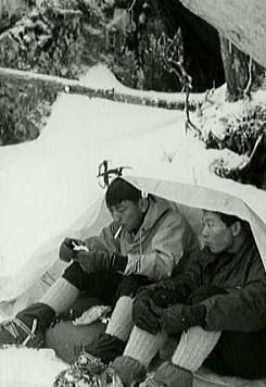 金峰山 急変した五丈岩風が出たと思うもなく吹雪になり.突然地吹雪に変わった。 五丈岩下の金峰山の平坦地で休んでいたが.五丈岩に登るどころか立ち止ることもできず。 山頂小屋に身を隠す。頬とわ云わず.手も足も股までも強く引き裂く寒風に叩かれ.地吹雪が体をこばらす。 叩き付ける風に僕は身を屈め.頂稜から小屋へ逃げ込んだ。 五丈岩下で金峰頂上小屋 小屋の入口は左の谷側に回り込み.最初の狭い窓から入っている。頭から突っ込むよう入ると.既に1パーティーが休んでいた。 その後.キャラバンに手袋一つ持たぬパーティが現れる。 無謀な姿を見て無言の沈黙が小屋を漂わしていた。 彼等からは言葉もなく.又疲れて黙るでもなく.小屋に居る全員が重い沈黙に押し潰されていた。 互いに何も言えぬ雰囲気がこの小さな小屋の空間を占めている。何か言葉を出し.批判しているよう見られるのが嫌だった。 何も云わぬ彼等. 僕等は互い居たたまれず.無言に近い合図で外へでる。外は治まる様子もなく.ただ荒れ狂っているた。 時は,それ程経っていなかった。僕等から一言.声を注し述べるべきか.迷いの末外に逃れている。 やはり窓から出た。頭から出す顔に衰えぬ強烈が吹雪となり頬を打つ。 云いそびれた言葉に悩むが。彼等は小屋で震えながら.他人に何も言わせぬような雰囲気をかもち出していた。 僕等はその姿に逃げている。良かったか? 分からないが後味悪く外へでた。 外は更に荒れ狂い地吹雪は唸る。 |