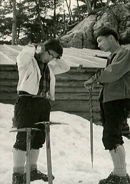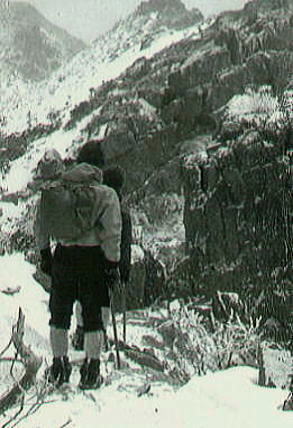 | 瑞牆小屋 連休も終わり.午後の山小屋は人影もなく静けさが戻されている。 窓からは柔らかな午後の日差しが小屋を包むよう漏れだしている。無言になり見るでもなく見る淡い陽光は板の間を照らしていた。 静かだ!土間に寝転び誰も居ない小屋の天井を見詰め.言葉数少なく,小屋の息を楽しむ。 時刻表を睨み,時間一杯までこの小屋に留まることにした。 そして飛ばしに飛ばし.バスの運転手に掛け声を掛けバスに飛び込んだ。 初日.増富にて.田沼.三浦と私反省 第一の目的は一年間の基礎知識を地盤として.時期相応にあった広い範囲の生活知識を習得することだった。 特にその中に掲げたものとしてツエルトによる幕営.ワッパ.アイゼンワーク.食生活等にある。自覚して山に登る必要があると考え. 雪上の生活をも含む技術山行を行っている。そして山域は足を踏み込んだことのある奥秩父.西面を選ぶ。 計画では初日に金峰山を越え朝日岳付近で露営.し 翌日はそこをベースにワッパ等の訓練を。 三日目は秋山から増富に下るつもりでいた。だが入山が思うよう進まず.このような日程に変わっている。 一年前はピッケルも持ったことがなかった。それがアイゼンにも慣れ.小さいながら自分から雪山を目指し始めていた。 今回の山行は何でも学ぼうと欲が湧き.当たり前のシュラフを濡らしてしまったが.結果的には強い教訓を得ることになる。 ただ一応.目的が達成されたとは云え.余りにも広く各種の知識を得ようとし.肝心の荷の軽量化を怠っている。 ピッケル(シモンスーパーD).アイゼン(8本刃).輪カンジキ(越中芦峅寺)@570.シュラフカーバー.購入. 次回は4月.今回の山行を踏まえ,改善することが多過ぎるが.積雪期八ヶ岳.阿弥陀南稜に夢を膨らましていた。 又阿弥陀岳から帰京して.40年度RHC年間研究目標は「ビバーク」に決定したと知らされる。 金山平より本谷川→塩川→釜無川→富士川 12:52瑞牆小屋13:23一14:35増富:49一16:10韮崎18:07.臨時=新宿 雪と氷の金峰.瑞牆山Top 山の経歴.経過Top |