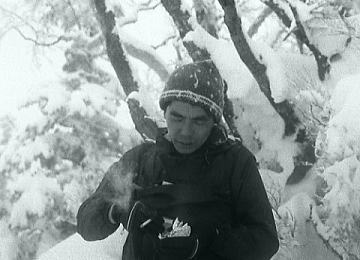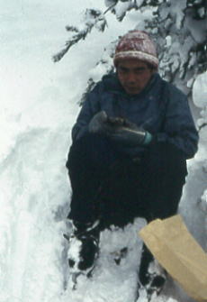 昨年.東吾妻の野宿と云う苦い経験があるにも関わらず愚図ついた天気の中.再び吾妻へと列車に飛び乗る。 昨日一日中.降り続いていた残り雪が斑雪となり.米沢への車窓から路肩にも積り臨まれている。 重い層雲に覆われていた。米沢に近ずくと列車の外は早くも夕暮れの薄暗い闇が近ずき始めている。 続く荒天とツエルト 昨年は擬似好天に遇い野宿した。その二の舞だけは踏まないとツエルトを仕入れ.ローソク.地図.磁石と装備を万全に。 食糧も行動食としてチョコ.チーズ以外は適当に我が家の駄菓子を持参している。 天気回復の兆しはなく.何か重い空気を抱かせられていた。相棒は昨年と同じ先輩の見城氏。 荒れても如何にかなる安心感を抱かせてくれる先輩だが完走するに越したことはない。 八端君 車内で偶然.後輩八端君に出隅わした。残念ながら退部した彼.私がOBとなってからよく共に山に入った後輩である。 真夏の沢登から正月の後立までよく働き付いてきた。 期末試験を終えたばかりで.これから蔵王に寄り.郷土の秋田へ帰ると語っていた。何処にも部属していないと聞き.余計残念だった。 牡丹雪 久振りに乗る特急に東北のスピード化は凄まじく.4時間足らずで米沢に着く。 米沢駅前の広場に立つと激しく雪粒が降っていた。舞うのではなく雨の如く雪粒が落ちてくる。 丁度帰りの通勤時間帯.駅前のバスタータナルには人の往来が激しく.皆背中を丸め家路へ急いでいた。 大粒の涙のような雪塊が留めなく溢れるよう夜空から舞い降りる。.駅前の街路灯に映し照らされているのは流れ落ちる雪粒。 疎らなスキー客や家路を急ぐ人達の肩にはボタン雪を見る見る積もらせていた。 拳を思わす余りにも大きなボタン雪に驚き眼を丸くさせられた。初めて見る本当の大きなボタン雪。 前に桁違いのヒョウが降ると聞いたことがあるが.信じられぬ大きさは正に似ていた。 留めなく降り続き泡のような柔らかく.それでいて重く湿った雪粒は視界を完全に閉ざす激しさだった。 舞うのではなく.カーテンのよう流れ落ちてくる。 天候だけに掛かっている今回の山行は天狗石から歯ブラシ状の樹氷に被われた国境を西大嶺へ進み.小野川瑚の雪原へ突っ込もうと考えている。 春しか味わえない積雪の径のルートは.積雪さえあればよく.天候のみで迷うことはない。眼下には小野川瑚が一面に広がっている筈である。 磐梯山の素晴らしかったツァーを夢をもう一度。時間に寄っては郡山で同期大川に会おうかとも。 晴天でのフル活動.荒れていたらどうしようもない。全ては吾妻の遠望できぬ霧に掛かっている。 この時期.頂稜は90%がガスに被われていた。 その上.東京を発つ時は上り坂だった兆候が.逆に崩れ米沢では雪が降りだしていた。 私達はめげず白布高湯へと向う。 |
