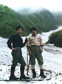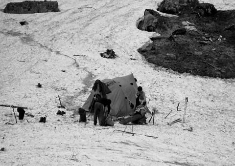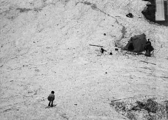 1張のテントBc 雪渓末端とも云うべきデトノアイソメは一面の雪原状をなしている。 道中.残雪を期待していたわりには余りにも少ない残雪のせいか.大きく構える雪原は驚きの感を覚え込まされていた。 駒ケ岳.中ノ岳.八海山と越後三山を囲む渓谷の中心に水無川があり.その谷底にデトノアイソメがある。 4つの沢を合わせる河原の出合は見渡す限り雪の原で埋め尽くされていた。 私達は兎も角.人気の全くないスキーと登攀を楽しめる台地に辿り着く。 雪白き雪原と若葉の青さ。残雪のはび込む山肌と岩稜。大きなスラブの上には深い空がある。 その中.黄色い冬天が艶やかに冴え立てられた。 不動沢 1本板スキー 雨の束の間.Bc周りで見城氏と遊ぶスキー板を折る 飯前に西不動沢でひと滑りするつもりだったが,初日にして早くもスキー板を折る。 転倒することもなく呆気ない折れ方に.拍子抜けも甚だしい。 雪質は堅いデブリで雪表は荒れているものの.理解しえぬ折れ方だった。背負ってきた努力も空しい。 責めて一日.滑らしてくれれば良いものの。まだ慣らし滑りで.谷上流からの滑降もしていなかった。 残念だが明日は1本スキーでも試してみようか? 無意味な言葉がでる。 雨上がりのBcより5月05日Bc3.雨午後強し. デトノアイソメ停滞.保坂さん入山 雨漏り 昨夜は薪が湿く燃え出すまで奮闘した焚火に水を刺された格好で雨が降りだしている。 慌ててテントに飛び込んでから丸一晩.雨は降り続いていた。 今朝も小雨が降り注いでいる。目覚めに「雨だ!」との声を聞き,再びシュラフに潜り込む。 今日予定のの登攀は無理かも知れない。雨が切れば直ぐ乾く岩肌。その雪と岩の御殿がテントを囲んでいるものの。 目の前に吊り下がる内幕が見ていても重そうだった。雨は飽きることなく降り注いでいる。 雪ではなく雨が降り.内幕に広がるシミは次第にその領分を広げている。 冬天の張り綱を張り直すも.それ程気安めにならなかった。 今日は保坂先輩がテントを訪れる。遅い先輩の到来に焼きもちしている内,又雨は更に激しさを増していた。 デトノアイソメは入山と共に重い雨雲に覆われ.流れ込む霧は春のうす汚れた雪渓を更に変えてもいた。 昨日までの白く煌く残雪は消え伏せ.小鳥のさえずりさえもなくなっている。 午後より霧雨混じりになった。 時折止んで外に出るも.又待つてましたと雨雫が天から落ちてきた。 外は雪崩で削られた大岩壁に被るようガスが放徊し薄暗い陰を落としている。白糸の如く幾条も雨滝を生んでいた。 ガスは暗さを増し放射状に広がった厚みが岩肌を這い回り,私のテントに落ちてきた。 そして灰色びいた雪渓をも包み込む。デトノアイソメの全体像は入山当日しか望められなかった。 悲壮な保坂先輩の入山 3時.保坂先輩が全身びしょ濡れで現れた。 一人の入山者がガタガタ体を振るえながら遣ってきた。 渡渉に一代決心し胆を冷やし吊橋を渡ったと云う。そして今にも滑りそうだった草付を越えてきた。 頼んでおいた食糧の肉があればこそ.やって来なくてばならなかったと,先輩は語る。 誰にも当たることがだきず.着いた途端に喋りだした先輩。皆.黙って聞いている。 語る顔は悲壮だった。確かに荒れれば一人では不安きわまるルートだろう。 仲間に会った歓びと安堵が緊張感を解し,語らせている。 それでも喋り捲くると次第に落ち付き.溢れ出す充実感に酔い始めていた。 コンロを点けテント内を温めると紅茶を旨そうに飲みだす先輩。時間と共に漸く笑い顔が出始める。 「ご苦労さん!」.「先輩だからこそ来れたのだ。」,同期見城さんは「頼んだ肉は!」.「吊り橋を渡ったって!」, 段々と普通の会話になってきた。茶化す会話に安とと満足感が漂っている。 保坂先輩と滝ノ沢夕方.小雨を抜って1本スキーに興じたが馬鹿らしく岩壁に座り込む。 保坂さんが顔をだし.見城さんに田沼は不動沢に入り.スキーに興じている。 |
