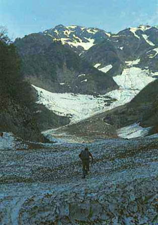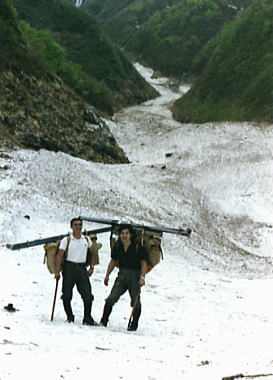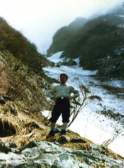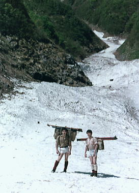 | 5月07日快晴.雪と岩と紺碧の空 Bc8:30一林道終点ト=大倉口.越後交通13:12=13:30浦佐14:03=14:28石打:35.臨時=大宮=19:15御徒町. 真っ青な朝 日増しに強くなる陽差しを浴び,入山と同じ真夏の下山日和になる。雨が雪になることを願い続けた山だった。 不動沢の眩い雪渓.乾いた頂稜の岩.左岸に若葉のコブシの花が遠くからでも臨まれる。 春山の空の下.ランニング1枚で荷作りをする。 テントも乾き出し食糧もよく食った。食べないと保坂先輩に怒鳴られそうだった。 それ以上に昨夜の焚火が利いている。 スキーは折れた間々背負うことになる。ツァー用バッケンが勿体無い。工具は持参していなかった。 又登攀用具は触れぬ間々残されている。やはり来た時と同じ背負子は一杯になる。 下山 遡った径を下る。 雨と強い陽差しに削り取られた雪渓は何処も大きな口を開け.その都度大きく高巻かねばならなかった。 底雪崩 30分程下って目の前のブナツルネ沢に底雪崩が起きる。 重く圧するような轟音が一瞬.空気を割り.地響きを立て我が身を踊らせた。 ツメにはび込んでいた最後の雪渓がどす黒い岩泥を呑み込み濁流の如く落下した。 そして小滝だった中程は怒号の渦に埋まり.下流を一面のデブリ・デルタで埋め尽す。 空気を割る稲妻と数十秒の一瞬を呆気に取られ見詰めていた。もうここを抜ければ吊橋へでる。 メンバー ガッツのある見城先輩 後から肉を持参した保坂先輩 様になりだしたマタ 下山.水無川を取り囲む山々を遠くに望み大倉へ モチカハナ沢出合の吊橋を補強修理に来た,大倉のトラックに運良く拾われた。帰りの渡渉もなく.ダブルの幸運を受けている。 次第に遠ざかる山々に車は畑を縫い.入山とは反対側の右寄りの里道を駆け下りる。 軽トラの荷台から望む水無川の山々が見る々遠ざかっ行く。 歩いては大変な距離.国道に沿ったバス停.大倉口まで走って頂いた。 閑散とした八海山スキー場が初夏を思わす春の強い陽差しを浴びている。 国道端の里には一面の菜の花が又艶やかに黄色く咲き競っていた。 水無川上流概念図 越後三山概念図デトノアイソメ 八海山 中ノ岳 越後駒ヶ岳ウォッ地図 周辺の山々 s43年07月. 荒天と猛暑の越後三山 s44年08月. 八海山神社と盛夏の八海山,同期会 s47年05月. 残雪の越後水無川.デトノアイソメ 水無川上流地形図 拡大図 2002.10の北沢と真沢 |