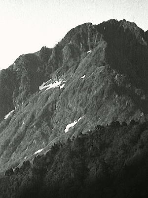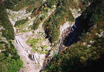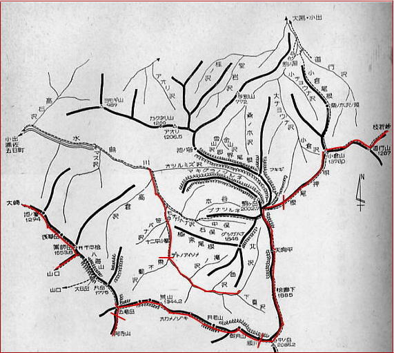 5月04日晴. 魚ノ川ホテル.タ\2200=林道終点,高倉沢出合8:20一15:30デトノアイソメBc2.3.4 山間の林道 以外と少なく見えた八海山の残雪に見惚れている内.国道大倉を過ぎ.里道はやがて畑の中を抜けて行く。 中型タクシーが漸く通れる程の狭い林道を勢いよく遡る。 何時.通行止めになるか.分からぬ先の見えぬ細い林道は意外と確りした轍を残され踏み固められていた。 初めてここを通ると云う運転手.聞かなければよかったと思うほど,無鉄砲過ぎる運転に恐怖心を増さしせていた。 この先.扇状に広がる大地の先.部落があると思っていたのだろうか? 先にも気にせず運転手はむやみに走り続けている。 小幅の道と交差する所からは両側は背丈を越すススキを掻き分けていた。スピードを上げ脇見も見ずに小道を突っ切り進んでいた。 広い河原状の大地を横切る。この道幅狭い林道は奥へ奥へと進み.金山橋を右岸に渡り.改めて立派に築かれた林道が現れた。 ここは大きなアーチ型のバリケートで塞がれてた。通行止めを示すオオ沢の出合だった。 対岸はもう目の前には越後水無川特有の急渓が驚く程真近に迫っている。 谷間が急に狭まり山奥に入った感じを受けるものの車がこんな奥まで入れるとは思いもしていなかった。 下車した足元には深い谷が押し開かれたよう谷間深くまで掘り下げられていた。出合に鋭い岩壁を覗き見る。 修理・・目差す岳を望み.入山早々針金とタコ糸で入渓 歩き始めて直ぐ,私の背負子の柄が切れた。何故かマタのザックもそれに連鎖するよう切れた。 不思議な切れ方に不吉さを感じるもものの,仲が良いと先輩は茶化し笑うのみ。針金を用いて応急処理を取る。 ザックに重なる荷が重た過ぎる。この後切れぬことを願い.気にしながら盛夏を思わす蒸し暑い渓谷に入り込む。 強い陽差しを浴びての登高 汗ばみ出した体に.汗はもう留まることなく流れ出していた。 右岸.枝沢に架かる永久橋を渡ると郡界尾根を鋭く割る.ねじれの大きな渦滝が本流に落ち込んでいる。 林道を離れて2本目.モチガハマ沢出合の吊橋にでる。本流は大きな廊下の渓谷を築いていた。 如何にも抗の抜け落ちそうな斜めに傾いた吊橋は太い針金2本で如何にか支え張られていた。 どう見ても渡れそうもない。足場の橋床もかなり崩れ落ちている。 万一.落ちても背負っているスキー板が支えてくれると,冗談は出るものの.やはり渡渉して尾根上を巻くことにした。 流心の流れは強い。渡渉するのに時間を甚だしくロスする。 例年なら.もうとっくに雪渓に被われる筈の本流は所々に残雪が見られるものの心もとなかった。 その先笹穴沢出合はデブリで埋め尽くされていた。ただデトノアイソメまで十分な残雪を踏み続けることなくデトノアイソメに至る。 |