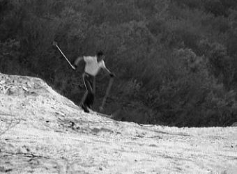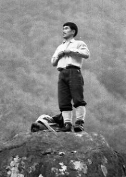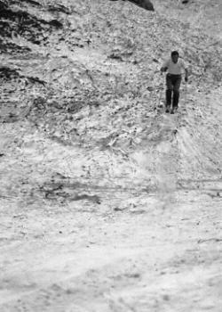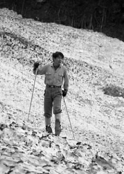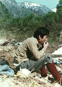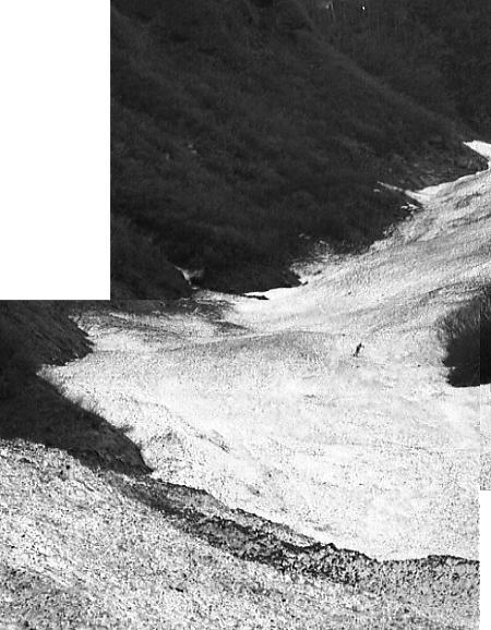 | Bc付近 グリで下りながらデブリの山を越えベースに戻る。 マタがスキーを始めたので.その間々滝ノ沢出合まで本谷を遡ってみた。 乾き切った中岳北面の岩場が素晴らしい。殆ど雪を付けず本谷へ落ち込んでいる。 マタと先輩が小さく豆粒の如く見下ろされた。でかい谷の雪渓に蟻の如く小さく見える。 1本スキー ゼンマイ.フキと山菜採りをして.夕方まで1本スキーに興じる。 皆が滑りまくる中.滑らないことも頭にくる。せっかく背負ってきた折れたスキーを。 1本スキーのコツも如何にか分かってきた。滑る派手さはないが現実に滑る楽しさはある。 ただバランスを崩すと大変なことになる。エッジを立てても不安定さが体中がボロボロにした。 他の者が滑っている姿を見るともっと頭に血が昇ってくる。 焚火 谷間いっぱいに星座の群が埋め尽くされる。今日はよく乾いた枯木が勢いよく燃えている。 太い倒木を投げ込むと炎はより強く夜空に昇ってゆく。昼間まで3日間.降り続いた雨が嘘のようだった。 入山以来誰一人会わぬデトノアイソメと水無川の谷。 雪渓に映る焚火の炎があわゆく揺れ.テントの張り具合も立派に見える。 |