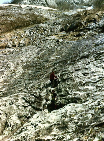 | 一枚岩 真川を右に別け.更に下真川の出合から雪渓沿いに北沢に入り込む。 右岸デブリを集めた一枚岩が這い上がっている所にでた。既に乾いたスラブが蒼空に突き上げている。 馬鹿でかいスラブにマタが攀じりだす。ビブラムにぴったり吸い付く岩肌が快い。 私はいい所があったのでスラブの真中に座り込む。乾いた程好い感触にちょうど腰を据える場所があった。 もう岩肌は暖かみを持ち明るい谷間に変えていた。十二平から望むと,ここは沢を1/3ほど登った所になる。 更に頂稜まで続く雪渓はこの直ぐ上で空に切れ覗めなかった。余程急になっているのだろう。 雨で断念した登攀が今ではトカゲする場所になっている。 |