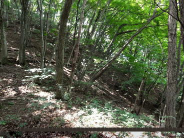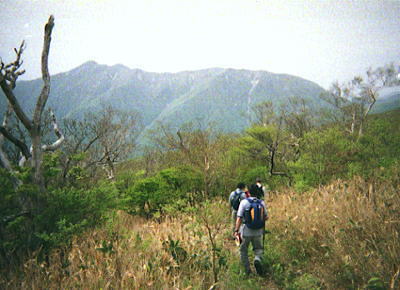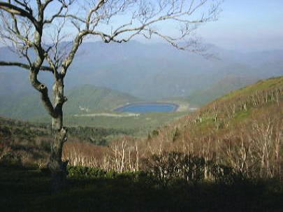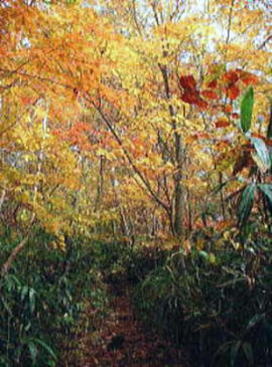 | 月の輪熊に出愚わす。 三本槍ケ岳を越え大峠へと尾根筋の潅木混ざりの小径を歩んでいた。 秋の明るい陽差しを浴びながらのんびり下り返す折.眼の前に黒い獣が突然現れる。 せいぜい10mか.15m先をツキノワグマが突然.尾根を横切る。唖然と立ち止まる大川と私。 体が固まり動かず.逃げることもできず.眼は据わってしまっていた。 ゆっくりした動作で目の前を黒い大きな物体が横切った。私より大きな熊は姿を消し大分達っているが動けずにいる2人。 目の前が真っ暗になり.何も分からなくなる。熊か? 互いに確認し頷く大川.彼もまだ言葉がでずにいる。 ほっとするも気はまだ整理が利かず焦っていた。言葉もでず.留まっている息は荒く.漸く激しく鼓動も治まった。 先に行くにも悠著した。 暫らく何も言わず.まだ互いに黙っていた。まして先頭に出る者はいず.互いに譲り合う。 真近で見え過ぎた熊.ジャンケンで先を決めるも.又何時現れるか不安が募る。 三斗小屋への径 大峠の下り散策の径 三斗小屋の台地.山に囲まれ澄んだ空に一段と紅葉の鮮やかさが冴えていた。 山上とは違った森の中の繊細に映る錦秋美。樹葉の華麗なキラメキが光り.葉の一枚々の色合い豊かさ。 紅や黄金に染まり.その重なり合いが奥深さが秋色美の美しさを彩り立てていた。 日ノ出平の中腹から望む沼原池.2006年06月沼原調整池→深山湖(下池)→那珂川本流 三斗小屋から沼ッ原への森の径.しっとりした足にも優しい.歩き易い山径がその森を綴っている。 華麗なる紅葉から一変し.黄葉一色のブナの森に変わる。ブナは大きな実を落とし落葉が径を被い.心をも優しく和まさせていた。 艶やかな紅色の森を潜って来た後のブナの小径はまた違った秋の味わいを感じさせていた。 この山径は歴史的には元禄年間に幕府の出資で会津藩が「会津中街道」として開かされ.参勤交代に4度通った街道でもある。 その後は脇街道から人も通らぬ廃道となり.今は登山道とし利用されている。三斗小屋が宿場跡と誰が思うだろうか? 沼ッ原.急に開けた湿原に立木は衰え.明るさを増していた。葦が茂げススキが群がり棚引いている。 広々した湿原の木道の先に沼原があった。我が国.最大の揚水発電所とのこと。 湿原の南側には昭和44年に発電用の上池として造られた。 その調整池を抜け板室温泉のバス停まで以外と長い最後のアスファルト道路を下った。 会津中街道 江戸時代の会津西街道の代替街道として.整備された街道。 1683年(天和3年)の日光大地震により.鬼怒川の支流.男鹿川が土砂で堰止められ五十里湖が造られている。 それまでの会津西街道は水没し通行不能になり.会津藩主により整備された新しい街道。 氏家宿から矢板宿.根室宿を経て那須山中の三斗小屋宿.大峠越しの城ノ内.松川宿などを経て会津に至ている。 しかし西街道は再整備されたが.次第に使われなくなり.脇街道から1704年(元禄17年)には通行困難になっている。 会津藩.越後藩の各藩主が2代.参勤交代で通行していた。 秋の裏那須と若葉の南那須Top 同期会山行Top 若葉燃える南那須.南月山