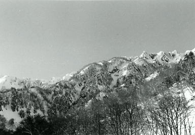 | 鳴沢尾根 鳴沢岳は他の岳と比べると鋸の歯のような山容を示している。そのU峰から派生している顕著な尾根が鳴沢尾根だった。 尾根末端は急でブッシュが多く相当なアルバイトであり,上部は鳴沢U峰直下約400mが雪のクロアールへ消えている。 主稜直下のコルへ鳴沢側の斜面をトラバース気味に通過するには早朝の雪の締まった時間以外に登る方法を見付られなかった。 赤沢のツメの50mのトラバースが雪質を不安定にさせていた。 登攀 深いラッセルに急登と淡雪が頂稜への支稜を被い.息が荒くなる。 マタのラッセルの後は直ぐ私の番がくる。樹林を抜け雪稜を望み喘ぎ登った。 疲れより登頂の歓びがまだ勝っていた。汗と雪粒の冷たい感触が快い。 強い陽差しに霞が掛かり.最後の岩稜が残されている。 小さなガリーの先に頂への稜が眺められている。 ガリーの雪壁は20mもないが深く切れ込むトラバースに悠著した。 マタと二人.眼前の雪壁を覗み綴りゆく頂への最後の雪稜を見詰めていた。 昼近い。時間はあるがヤバイ。 雪崩る可能性は半々.トラバースに40分として後は雪を飛ばした裸の岩稜がある。 ガスが切れ.後立の頂稜が濃紺の空に頂を覗かしていた。 ザイル1本が足りるか足らぬトラバース 「諦めるか?」.「そうだな!」.二つの言葉で全てが終わった。天を仰ぎ長い時間を費やし休む。 目先はまだガリーの雪壁にルートを求めていた。 後は下るのみ.一歩が数m.二歩が7.8mと落ちるよう下る。 停まる事が難しい程,雪の斜面を駈け降りた。 今まで稼いだ高度もあっと云う間に落ち.小さな小さなテントを河原の雪原に見付けている。 |