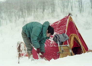 | トレースから見て.今年も籠川谷に入山者はいない。 静かな二人だけの夜を迎える。圏谷を被う空にはまだ星が煌いていた。 再度.アタックも考えたがトラバースするには翌日の方がが危険と考えられる。 又トラバースせぬ直登ルートは最後のツメを越えられる技は持っていなかった。 下山 登頂せずの停滞。天気も崩れだし気が抜けたようで急遽下山を決意する。 それ故.撤収は午後近くになり.列車は夜行で新宿は朝帰りになった。 正月の上野 私の家で酒を交わすがそれ程強くないマタは適ほどで顔を赤らめている。 ゴロゴロ寝転びながら酒を汲み交わす。 正月早々.家で自炊するのも可笑しいと外へ昼食を求めたのが失敗した。 街は寂しかった。正月を東京で過ごすのは6.7年振り。 上野駅周辺は一軒も開いている店はなかった。歩きに歩いた末.上野駅で別れる嵌めとなる。 最悪のシナノリは最後まで続いた。東京.最後も情けない話しで終る。 ベースキャンプbc1.2.3 ベースの鳴沢台地で ![]() マタ |