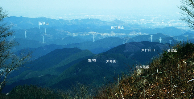 南部は東京都(青梅市や奥多摩町)との境界尾根に日向沢ノ峰・長尾丸山(長尾ノ丸)・棒ノ折山黒山・小沢峠の山々と続く.
