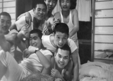 ジンギスカン料理を囲んで右から新津.滝島.鴨田.鈴木.各先輩