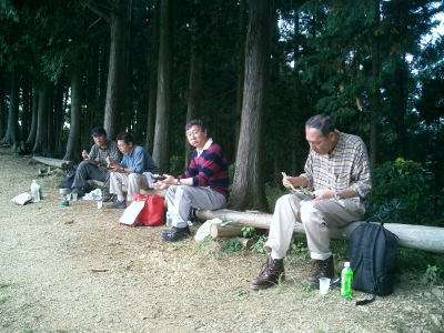 丸太のベンチが一列に並び.それに従い誰ともなく座っている。以外と他のハイカーとのすれ違いも少なく静かな頂だった。