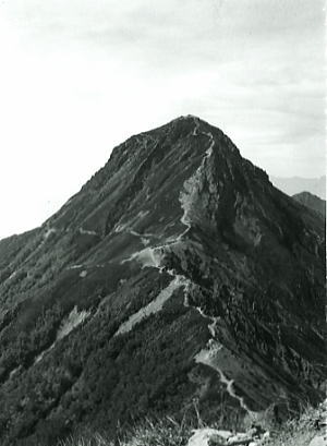 3日目.白樺湖―蓼科山.山頂ヒュッテh2 山道に入り皆,なかなか起きず.出発はとうとう昼頃になってしまった。 人気のない白樺高原を横切り八子ヶ峰を横に見ている。テントを背負って来るには良い所だった。傍に小高い緑の台地がある。 葦茂る高原を暫らく行くと蓼科スカイラインにでた。真新しくジャリがひかれた歩き難たい道が造られていた。.ここから登り返す。 この先は削岩され騒音を撒き散らすスカイライン工事現場が続き.時折ダイナマイトの破裂する音色も耳にしている。 工事現場を横切ってから軽い食事を済ませ山道に入る。コースタイムは1時間50分は違っているのでは? 酷く歩きずらい道が続いていた。 山頂小屋 夕方.小屋の主人がケチで評判だと云う頂上小屋に着いた。話しとは大分異なり.親切でサービスも優れていた。 今回は山行中自炊を通す積もりだが到着が遅いので,ご飯だけは炊いてもらっている。 又運よく今日.母校の日大一高が東京代表で甲子園に出場した。ラジオで観戦.その祝いにとカレーを無料で頂いている。 又寝る時.地震が起きてもしょっちゅうだから心配しないよう助言を受けるが.この日は起きずホッとする。 夜半.小屋番から気味の悪い話.昔からの聞き伝えられている昔話.お化けの話を聞かされた。 誰もがやな思いをしながら.好奇心が先に立ち.聞き惚れ離れなかった。 参考書.ブルーガイドブックス「美ガ原・霧ガ峰・蓼科」,実業之日本社.37.7.15初版,¥180・・北八ヶ岳地形図 蓼科山―麦草峠 双子山より蓼科山4日目.蓼科山―双子池―雨池―峠.麦草ヒュッテh3 蓼科山頂.日の出を仰ぐ無事.地震もなく.初めてご来光を小屋前の頂から仰ぐ。今居るここはガレ場の頂に当たり.大きな石がゴロゴロしていた。 下界はガスが掛かり.真夏でも肌寒 これから歩む八ヶ岳連峰を前にして.その奥に連なる南アルプスの山々が雲海を突き破るよう望まれた。 6時.小屋をでる。急なガレを下り広河原にでた。将軍平から広河原までは森の中.山道は歩きずらく悪い。 根が這い出し.倒木に窪地.平伏するが歩き難き道が続いている。 時々.ダイナマイトの破裂音が響き渡ってきた。昨日.通った峠へのスカイラインの工事のようだ。 2.3年後にはここまで車が入るのだろうか? ゴーロの広がる大河原峠双子山までは原っぱ道を進み.下りは落葉松林の中を潜り.双子池に下りている。 入口脇の机に乗せられた2つの洗面器には右は洗面用.左は飲料水に判れていた。ただ共に汚れが酷く.虫がウヨウヨしている。 どちらを選んでよいか判らぬほど汚れている。 ヒュッテの番人が「ひと雨降りそうだ!」と言う言葉で慌てて.小屋をでた。 田村と彼との出会い 今日の第二の関門である急な荒れ気味の道の中腹で昼食を取り.雨は降りそうもなかった。 食事中.御殿場から出向いた青年に出会い.バナナを御馳走になる。 彼とは横岳.雨池の分岐まで一緒に行動し.麦草峠での再会を約束し別れている。僕等は雨池へと下る。 雨池は遠くから望むと森に囲まれたお伽の国のような雰囲気のある湖畔で.見るにつれ.森に漂う風情が何とか気を引き付けていた。 ここから今日の麦草までは森を綴る平坦な山道が続いていた。 歩き易く心地よい山道だが.入口が判りずらく少々悩み苦労した。 麦草ヒュッテ 麦草峠に着き.暫らくすると例の彼が現れる。3時.天気は曇ってきた。 行き通う登山者も少なく.小屋内の静かさも.その間々だった。 まだ高校生の登山は少ないらしく,ここでも歓迎された。小屋番や登山者に何かと気を配って頂いている。 夜.食事を終えランプが灯ると昨日と同様に.小屋番から怪談話を聞かされる。 小屋番の体験談だと云う丸山,冷山の化け物話。明日登ることになる山の話である。 小屋の主人から面白ろ可笑しく語るのを.我々5名は心臓が止まる思いで聞かされた。 僕等は気が小さい。聞きたくないものの話術に引き込まれている。 ガランとした2階を寝床にするも,.人で外へ出る勇気のある者は居なかった。夜半.用足しには闇の外へ全員で出向くことになる。 隣りの山の茂みにお化けが居そうだった。泊る都度おびやかされ.同じ行動を繰り返している。 1人でも遅れば全員が待たされた。 麦草峠―夏沢峠 5日目.麦草峠一天狗岳一夏沢峠,駒草荘h4. 昨日.お化け話を聞いたばかりの丸山は本当に薄暗く.ジメジメした薄気味悪い森だった。 覆い被さる樹林本当に今にも化け物が出そうで.日も通さぬ暗い雰囲気が漂っている。 途中で彼とは別れ.高見石に寄った。 道広は重く垂れ込めた空に.暗い樹林帯へ入るのを嫌がっている。彼はお寺の息子である。 新築したばかりの小屋があったが.中山峠までは霧が酷く何も見えなかった。 峠より黒百合平へ下り.ヒュッテの小屋番と久しく話す。茶を御馳走して頂いた。 天狗岳 ![]() 西天狗岳 天狗岳に立ち北八ケ岳と別れを告げると岩場が多く現れてくる。ピークで1ヶ所.スリルある場所があり.這い上がる。 道広を残し西天狗をピストンする。コル付近は残雪のような白砂の礫石の上