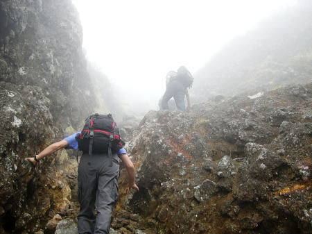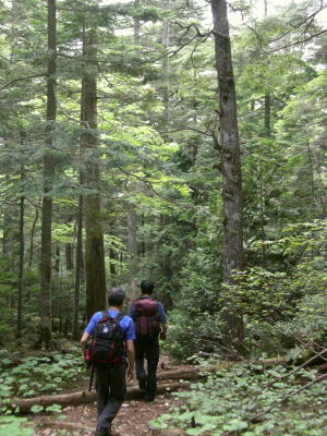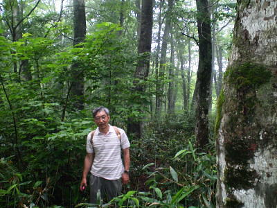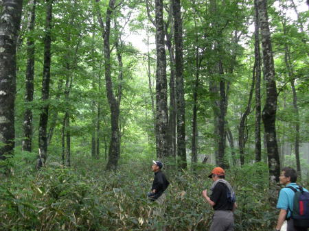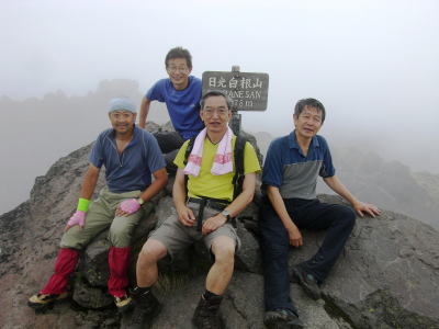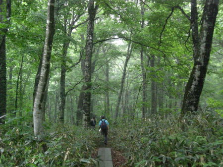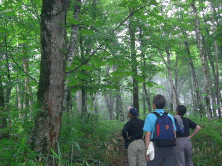 続.「日光への歩き旅」 ・・日光白根山Top 43年ほど前に子供達と2年数か月を経て.自宅の東京.御徒町から日光街道を歩み.戦場ヶ原.湯元から前白根山の頂にと立ち終えている。 今回新たに滝島先輩から菅沼からガス湧く奥白根山を周回するコースを歩もうと提案があり.奥白根山まで改めて登る運びになる。 山仲間と登る奥白根山と玉原高原・・新たな完結としての日光奥白根山 菅沼から奥白根山に立ち.金精峠へと周回―幡谷温泉で清水先輩と酒を交わし.翌日は癒しの玉原高原に回り込む。 2008年06月20〜22日.L滝島.m見城.鈴木.松村.(清水). 6.21.菅沼からガス湧く奥白根山を周回・・前白根山への長い足取り 6.22.ブナの森と玉原高原 滝島先輩から「6月に日光白根山に行こう!」と誘いがくる。内容は菅沼から入山して奥白根山。金精峠を周回し.幡谷温泉「ささの湯」に宿る。 又滝島先輩の同期.清水氏は登山はせぬが酒宴には出席すると連絡が入り.先月の両神山に続く.同メンバーのOB山行が始まる。 日光白根山は栃木県日光市と群馬県利根郡片品村の境界上にある標高2578mの山で.北側には金精峠を挟み鬼怒沼山.黒岩山が連ね. 南側は皇海山に架娑丸山が連なる関東以北の最高峰。別名.奥白根山と呼ばれ.安山岩のみから成る溶岩円頂丘。 最後の噴火は明治22年の記録がある。 コースは上州側は高丸高原からのロープウェーと菅沼からの弥陀ケ池コース.又金精峠コースは日光湯元から外山尾根.前白根山を経由するコースがある。 1965年05月の連休.高校時代には吹雪の金精峠に出向いている。単独山行でラッセルが深くなり途中で後退している。 当時は予想以上の豪雪に見舞われ.周辺の山々では大勢の遭難者を出している。 86年には後記の如く2年間半の歳月を掛け.小学生下級の子供達と東京御徒町から前白根山まで区道.都道.国道から日光街道へと繋げ. 里道や農道の畦道まで歩き.日光へと完走し.輪王寺.東照宮.薬師堂.日光廟大獣院.二荒山神社を見学している。 本来は地震が起きることを考え.親が住む北越谷まで国道を歩いてみることにしたが.日光まで延びている。 そして日光の山の頂まで登ろうと例幣使街道から第2イロハ坂. 木道の戦場ヶ原から湯ノ湖湯元で土道に変わり.白根山の頂に立つ。 幼い小さな足でも.日帰りの歩む旅を一歩一歩.続けて歩めば一年半ほどで目指した頂に立つ。その間にも旅や他の山も登り詰めていた。 それから長い歳月が経ち今年2008年06月を迎え.単独で頂を目指してから43年振りに.初めて日光奥白根山の頂に立つ。 前白根山と奥白根山の間も結ばれた。世代を越え妻と子供達と目指した白根山.子供達と共に我が家族にとって貴重な経験をしたことになる。 この1ケ月後.社会人になった娘も友達と奥白根山の頂に立っている。 地震避難のたに越谷の実家まで歩き.更に日光から白根の頂まで子供達と歩いた旅路も娘と共に結ばれたことになった。 入山前日.K先輩の幼馴染.八木原に住むK邸にお世話になっている。 畑の中にポツンとある「渋川スカイテルメ」で汗を流し.お邪魔するや宴会になった。甘えに甘え贅沢な酒宴を味わっている。 6月20日曇.jr上野14:16=伊勢崎=高崎=八木原.渋川温泉「渋川スカイテルメ」大展望風呂=八木原K邸泊. 6月21日霧雨 K邸=渋川IC(T.S氏と合流)6:30=8:00菅沼登山口:15一8:45小:55一9:25小:35:55弥蛇ヶ池一10:05分岐 一10:20小:30一11:00奥白根山. 笹の原を抜け 菅沼登山口Pより.8:25天候 入山前までは梅雨の中休みが続き.山でも日差しは顔をだす筈だった。ただ新らに北上した前線の影響で雨を覚悟しなければならなくいなる。 東京を出るなり雲行きは可笑しくなり.蒸し暑さだけが周りを包んでいた。 又先日.14日には栗駒山南部で「宮城岩手内陸地震」が発生.地震規模はM7.2.震源地は浅く8kで大きな被害を起こさせ世の中を驚かさせた。 1965年(s40年)夏.集中地禿岳へと細倉から花山ダムに入り.暑くて泳いでは.上流を遡った記憶のある地域だった。 今,その流域は土石流に埋まり.幾つもの地震ダムを創り.膨大な被害と多くの方の死者.行方不明者をだしていた。 弥蛇ヶ池.10:02入山 確り朝食を頂き.黒岩嬢に見送られ伊香保IC出口で滝島氏.鈴木と合流.沼田街道を遡る。早朝.鶴ヶ島を発って来た2人と笑い顔で合流している。 鎌田から沼田街道(尾瀬戸倉方面)へと分かれると通う車もグッと減り.街並とも離れ緑深きロマンチック街道を遡る。 路線バスの場合はjr沼田駅から関越交通バスで鎌田下車1時間15分.鎌田から丸山高原スキー場には30分で至る。 菅沼周辺はこの時期.マス釣りの釣人が以外に多い。ただキャンプ場は閑散とし閉鎖されていた。人影の見られぬキャンプ場だが.何処にも太公望はいる。 私も再び登り始めるまで10年間は河川があれば竿を出し.浅場のタナゴから大陸棚の沖釣りまで.船頭にからかれては竿を出していた。 往来も街道沿いはまだ無いに等しかった。向かいの丸沼は日本のマス釣りの発祥の地。明治時代はゴルフと並ぶ貴族,上級社会の社交の場だった。 英国人による中禅寺湖の鱒