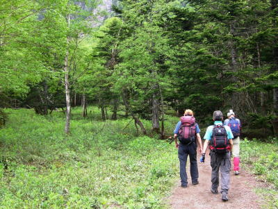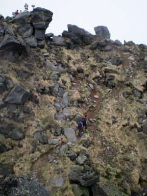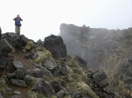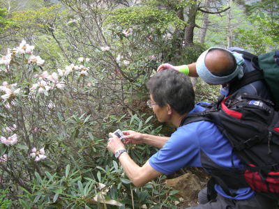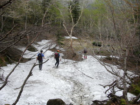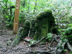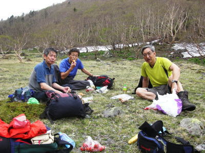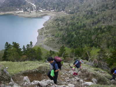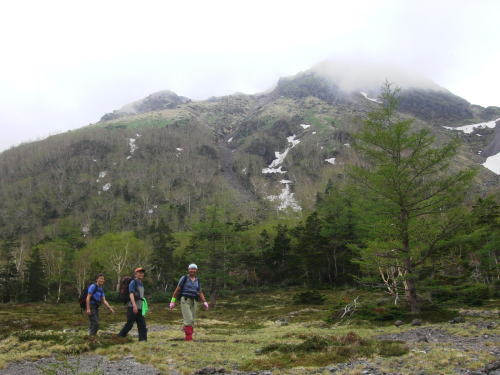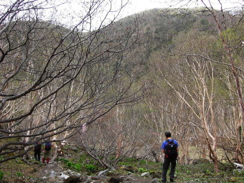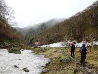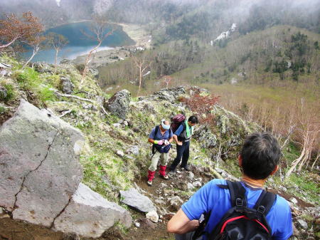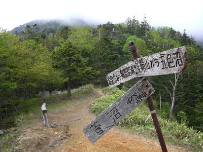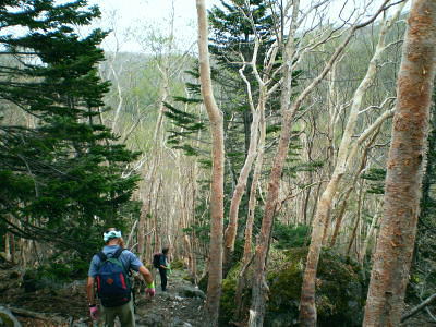 その後は続くか? 金精峠から根名草山を越え日光澤温泉まで一日の行程を歩めば平面図.1/5万ノ地形図の赤線は東京から越後平ヶ岳まで延びている。 その野望はまだ残されていた。 奥白根山〜五色沼〜金精峠 11:00奥白根山一11:45避難小屋12:10一五色沼一13:20五色山:30一13:55国境平 一14:05金精山:30一14:55金精峠15:05一15:50菅沼登山口=16:30幡谷温泉「ささの湯」@9.400 五色沼へ ![]() 黒いガスの塊は途切れることがなかった。ガスは切れそうで薄い白味を帯びた雲の塊に変わるも,陽光が差し込むまでの力はない。 少し下ると火口縁に建立されている二荒山神社奥宮でる。風を伴った重たいガスが渦巻き舞い上がり.下る足を早くさせていた。 肌寒く休む間なく前白根山鞍部へと下る。共に次第に明るさを増し.窪み状の山陰に入り 風も治まっている。 左下方に火山で堰き止められたエメラルグリーンの五色沼を見下ろされた。そしてダケカンバの枯木群を抜け窪地底の草原にでた。11:48 白根山と前白根山との鞍部 鞍部南側の岳樺帯.11:47酸性雨や台風.鹿の食害によるもので樹皮を剥がされた樹木がやたら目立つ。 雪解けの草原鞍部で昼食.11:52大休止 雪解けのまだ草木の寝転ぶ小平地に腰を降ろすと.乾いた草地が心地よい。蒸す暑さが体を暖めてもいる。 昨夜,お世話になったK嬢から昼食の差し入れをして頂き4人で弁当を漁っている。 稲荷鮨に明太子の結飯。ジャガイモサラダに胡麻合い.フキとお新香,豚肉の角煮もある。 贅沢なご馳走はそのまま摘みにも。ビールがあればと.つい誰からともなく言葉がでる。 赤い屋根の避難小屋.12:20五色沼避難小屋 谷沿いに五色沼へ下る途中の残雪の切れ目に避難小屋があった。前白根山へ登る分岐点にもなっていた。 汚れていると云われていた木造の避難小屋の扉を開けると綺麗に整頓されていた。20名収容. 扉から漏れる微光が奥まで射し. 黒光する床板が小屋の歴史を物語っていた。2段に造られた寝床.左奥には毛布が綺麗に畳まれ積まれている。 タタキの戸口の脇にはクワが置かれ.紙切れに便はクワを使うよう記してある。又ネズミがでますの張り紙も。 小さな確りした古い山小屋だった。テントを担ぐ気力はもうないが.これからは無人小屋の活用もよいだろう。 残雪を踏み五色沼へ.12:27雪白さもあり周りは明るさを増すも薄雲の中.前白根へ直登すれば足元の湯ノ湖が広がり.戦場ヶ原や日光表連山は望めるだろう。 T氏の提案で直接前白根山へでず.残雪を踏み五色沼を巻くことにした。 沢沿いの窪みで意外と多くの残雪を踏んでいる。午後の陽気で緩んだ残雪と踏み込む体重との兼ね合いが合い.上手いステップを切って行く。 緩い傾斜に程好く潜る残雪とズリ滑る感触が懐かしく心地よい。 五色沼 池畔からガスの切れた奥白根山.12:34五色沼では対岸に向かいコダマが響きハッスルするT氏。連呼するS氏。子供のようにはしゃぐ姿が微笑ましい。 昔ここで昼食を摂り.ラーメンをすすりながら子供達が飽きることなく大声を上げ.コダマを呼んでいたことを想いだしていた。 視界は全く利かぬものの.それぞれのポイントで雲は切れ始めている。点々とその場の情景を映し脳裏に焼き付けさせていた。 雨雲の密度は濃いものの面的には浅い層のようだ。暗くなり今にも落ちそうな雨粒は時として雲を割り視野を覗かしていた。 山頂で,ここ五色沼で.そして五色山手前でも。それでいて霧雨は時折舞い続けている。 12:55・・21年振りの同じ場所のスナップ地点カメラを向けると何故か昔の画像が頭に浮びひらめいた。子供達と東京からの最後の徒歩旅行で同じ場所でをカメラに納めていた。 前白根山に登り五色沼で昼食し,再び同じコースで五色山へ登った時のスナップ写真。 殆ど忘れてしまっている山中で.この登り風景が記憶として鮮やかによみ返り驚かされていた。 分岐より五色沼を回り込むよう五色山に立つ。 ここでも鹿の食害を避けるため鹿柵が設けられていた。ただ全ての柵は倒され.その役目は担っていなかった。 今年登った奥多摩や雲取山でも鹿害は甚だしく.木の幹を保護する柵が数多く設けられている。 外輪山と前白根山 12:18数秒の切れ目から前白根と奥白根の稜.中央鞍部に赤い避難小屋が見える。 五色山への登り.ここで幸運にも一瞬のガスの切れ目から先程の赤い屋根の避難小屋とその稜が望められた。 初めての大きな眺望に足を停めるも再び雲の中となる。もう五色山も近い。 s62年6月に子供達と東京から歩き最後の頂に立った前白根山。以外と記憶は薄いがこの全体造の眺望は記憶に留めていた。 最後に白根山と五色沼を一望し.シャクナゲの茂る尾根径を下ると平坦な国境平にでる。 国境平,ここより荒れた径となる.14:00国境平,右手に分ける中ッ曽根尾根を下れば湯元に抜けられる。昔下った山径である。 分岐に金精山への径は「亀裂があり危険」と記した立派な道標があった。2001年03月.金精山付近に地層の変化を生じ.亀裂が入る。 地割れ調査報告 南側から見た金精山は第三紀
