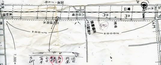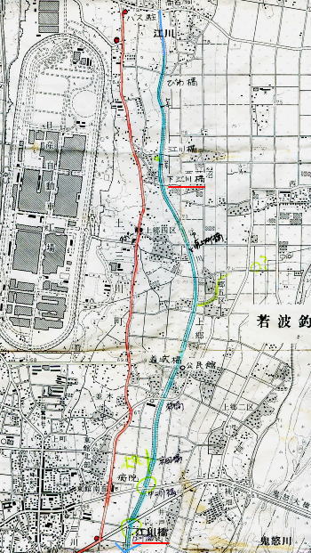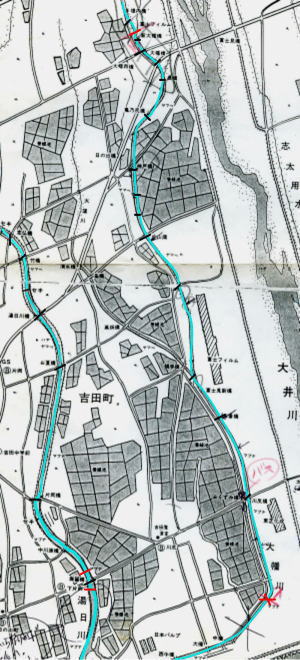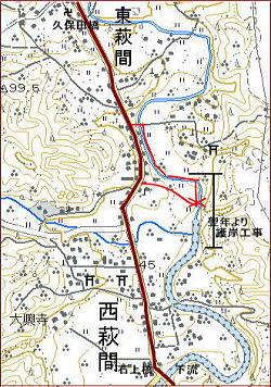 成案寺川 二股の前後に水門あり,水門とその前がポイント。