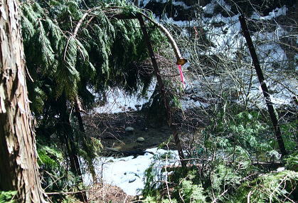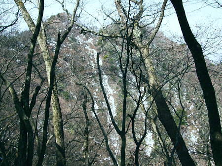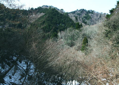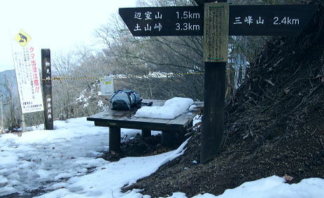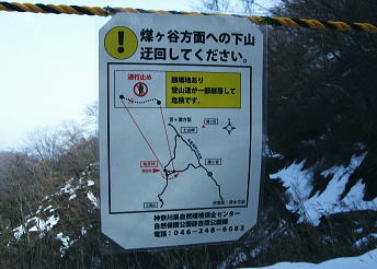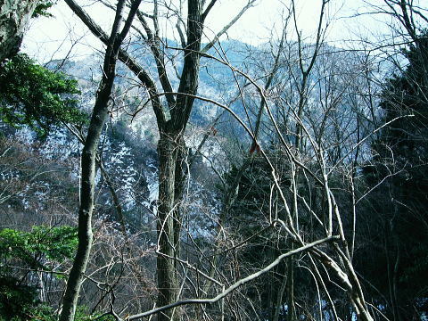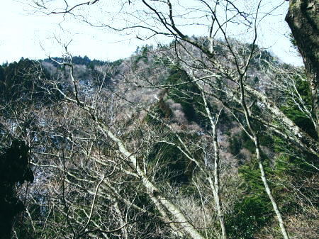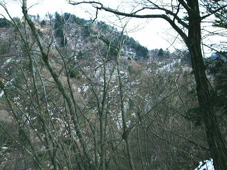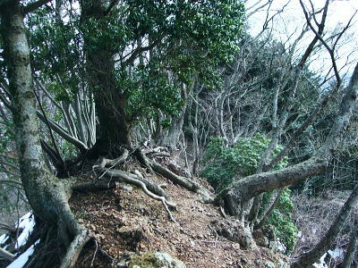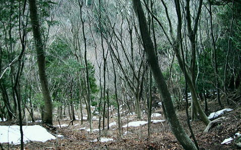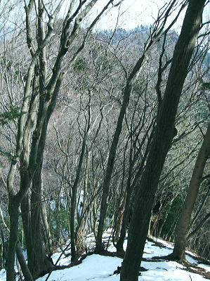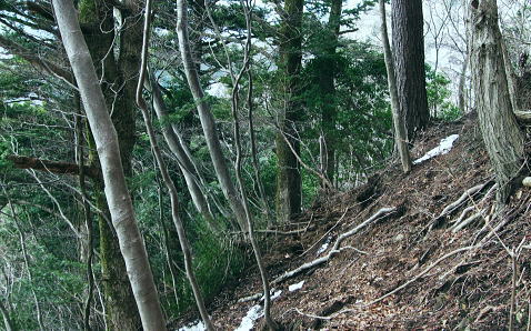 | 滝ノ沢左岸尾根から鍋嵐を越え物見峠 東尾根の偵察が実行尾根に変わり一宮沢左岸尾根を下降―積雪の唐沢林道に入り.古典的な物見峠を越え煤ヶ谷へ 三又路から滝ノ沢左岸尾根 一宮沢左岸尾根から物見峠越え・・園芸用のブレード付きスピッツ?と踏み跡の探索が実践へ 719m峰と手前のコブ 東斜面を振り返る.11:26宮沢左岸尾根 10:50鍋嵐11:25一11:50下降取り付き地点一12:20トラバース:30一12:50(554m峰):55一13:20唐沢林道(昨年4月と同地点). 残雪の東斜面. 鍋嵐東尾根を下る。腐った春雪が背稜の急斜面に乗り.滑ることこの上もない。 北尾根で見た足跡だろう。この雪斜面を登っている。その踏み跡を壊し崩しながら下る。激斜面で真正面に足が向けられず厄介だった。 枝木を掴む以外に方法はない。その上.積雪下の大地は氷っている。手のストックに力を入れ過ぎると足元が疎かになり足元から滑る。 暫し靴口にも雪片が飛び込んだ。すると直ぐ溶ける冷たさが伝わってきた。スキーならぬ靴のエッジで側辺を有効に利用し下るしるしかあるまい。 鍋嵐 一宮沢左岸尾根取付き附近.11:33一宮沢左岸尾根の偵察 小コブを1つ越えると陽溜まりの場所にでる。南側の側稜の尾根は地肌を現し始めていた。 コブから60〜70m程の所に大きなモミの木があり.梢越えに谷側が見下ろされる。次回の為に.りの地点だけでも確認しようと覗き込む。 谷底へ平均的に広がる起伏のない斜面.その先の尾根の落ち方が判らない。上からでは最後の起伏部分が皆同じような傾斜に見え判らなかった。 登り返せばと50m程下ってみる。地肌と雪面が半々に埋まる場所。下って直ぐ古い巻き道か.作業道らしき踏み跡が横切っている所にでる。 このトラバースする道は前回気が付いた熊ノ爪からの尾根径は719m圏コブ手前から左に巻き込む道のようだ。崩れて通行止めになっていた。 その踏み跡だと思われる。前回はそこを避け.反対側の北尾根に入ってしまっていた。 ルートが間違っていないことに気をよくし更に少し下っている。潅木の枝木の間に入り,展望どころか.中々先が読めないでいた。 同じような傾斜が続ききつかった。更に20m程下ると右手は扇状に広がる斜面が急激に谷間へ落ち込んでいる。 正面の谷は樹林に閉ざされ見えぬが右手の斜面は1つにまとまり落ちている模様。下るには先への予想ができず無理のようだ。 崩壊した東尾根南山腹の巻道跡?・・11:47左手下に緩い起伏を見付ける。尾根が起きている。左側の溝状に抉れた所へ移動すると少し先が望められ.緩やかに続く小さな起伏がある。 間違いあるまい。盛り上がる尾根は地図ではここでしか見留められなかった。並行して見える左側はほんの少しの起伏だが 下から逆に綴ってみると確りした尾根が起きている。719m峰から落ちる沢と一宮沢との間の尾根だった。 実行 偵察は自然と実践に変っている。登り返すよりトラバースした方が楽のようだ。ただここを横切るには意外と大きな労力を要した。 直線距離は短いが溝筋は雪被う急斜面。立木が少な過ぎる。その上ぬかるむ裸土。落ちれば止まらないだろう。丁寧にトラバースせねば。 鍋嵐の東コルより110m程登るとコルにでる。そこから100m程下ったやや急になる前が下降地点になった。 先のコルまで200m.その先に719m峰がある。偵察で下降した地点はその手前で.大きなモミの木が何本かある尾根巾でやや広い場所だった。 他に改めてポイントとなる目印はない。 扇状に広がる一宮沢源流 緩やかに思えるが落ちている.11:47小道具 アイスバイルがあれば楽にトラバースできる土斜面。今回はそれに替わる小道具を用意してきた。 道具名は判ららないがピッケルに例えるとスピッツとブレード(刃なし)鉄で18cm。プラスチックのシャフトは手持ち用として30cmの形をなしている。 刺すスピッツは8cmとぬかるんだ場所では短く利かぬものの.体重をその上に乗せれば如何にかなった。・・園芸用のブレード付きスピッツ? 木の根元を支点に体を伸ばし.足場を定めたうえでスピッツをゆっくり刺し.その上に体重を乗せて移動する。 打ち込みの繰り返しはバランスが大変だが1回目の動きは安心感があり楽に移動できた。 大山三峰山 熊ノ爪,物見沢右岸尾根より.12:24北峰小唐沢川右岸尾根と本峰竹ノ沢右岸尾根 ルートの取り方も考える。斜め下の移動は果てしないトラバースを強いられている。 真横の移動は意外と動きずらく.如何しても下り過ぎる傾向がでてくる。最善は斜め上にある。 上を見つつ登ると楽な姿勢の上部へ扇状に横断すると結果的にはトラバースし.やや並行するようなる。急斜面の尾根登りと同じだった。 沢沿いに登れば傾斜は緩いが.それだけ尾根との高度差が広がってしまう。兎も角渡って尾根上にでて.1本取った。 確りしだした一宮沢左岸尾根 緑濃い尾根.12:25地形図通り本当に周りと比べると平坦過ぎる尾根が築かれていた。それでいて側尾根の両下は谷底深く切れ落ちている。 尾根上に下りられればこのルートは終わったようなもの
